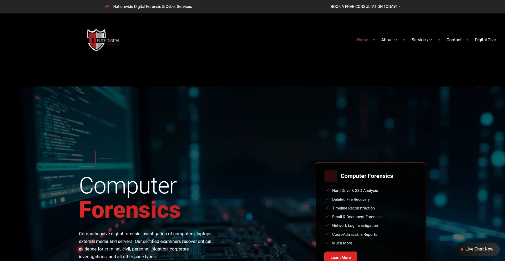 elitedigitalforensics.com 使用 Bootstrap,这是一个广泛采用的开源响应式网页开发框架。Bootstrap 通过标准化组件和样式实现移动友好界面的高效创建。