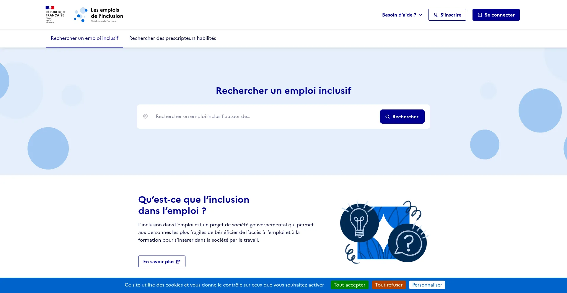 该网站实现数据收集表单,请求个人信息,包括姓名、电子邮件地址、电话号码或其他敏感详细信息。用户应验证 emplois.inclusion.beta.gouv.fr 的合法性并在提交个人数据前查看隐私政策。