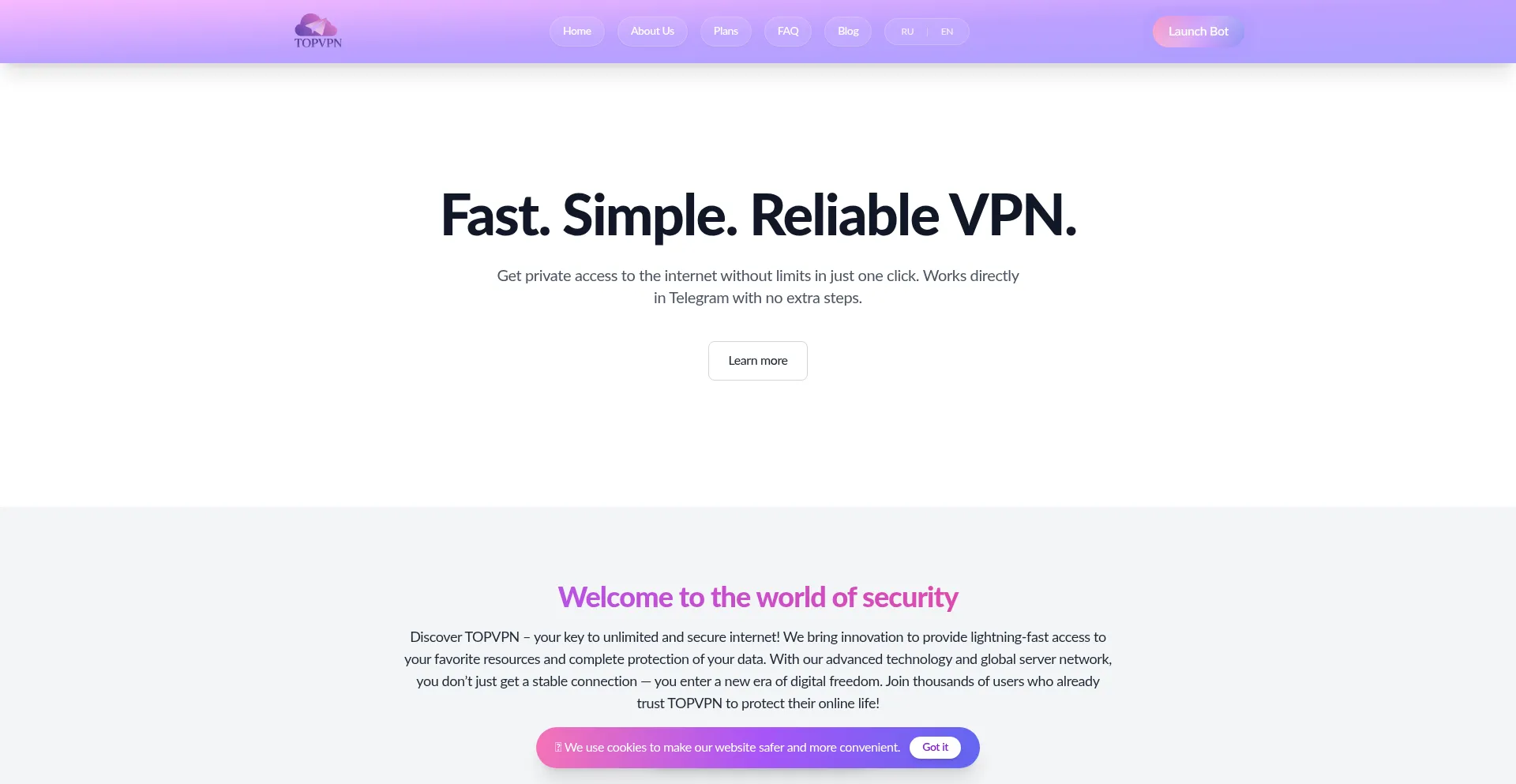 TOPVPN — VPN via Telegram Bot | Fast Access, Security, Ad-Free YouTube