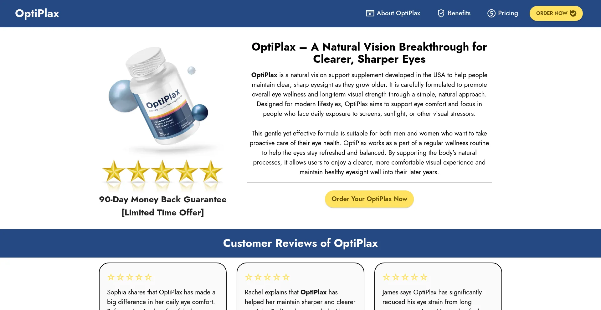 OptiPlax™ is a natural vision support supplement made in the USA that helps improve clarity, reduce eye strain, enhance focus, and promote long-term eye health.