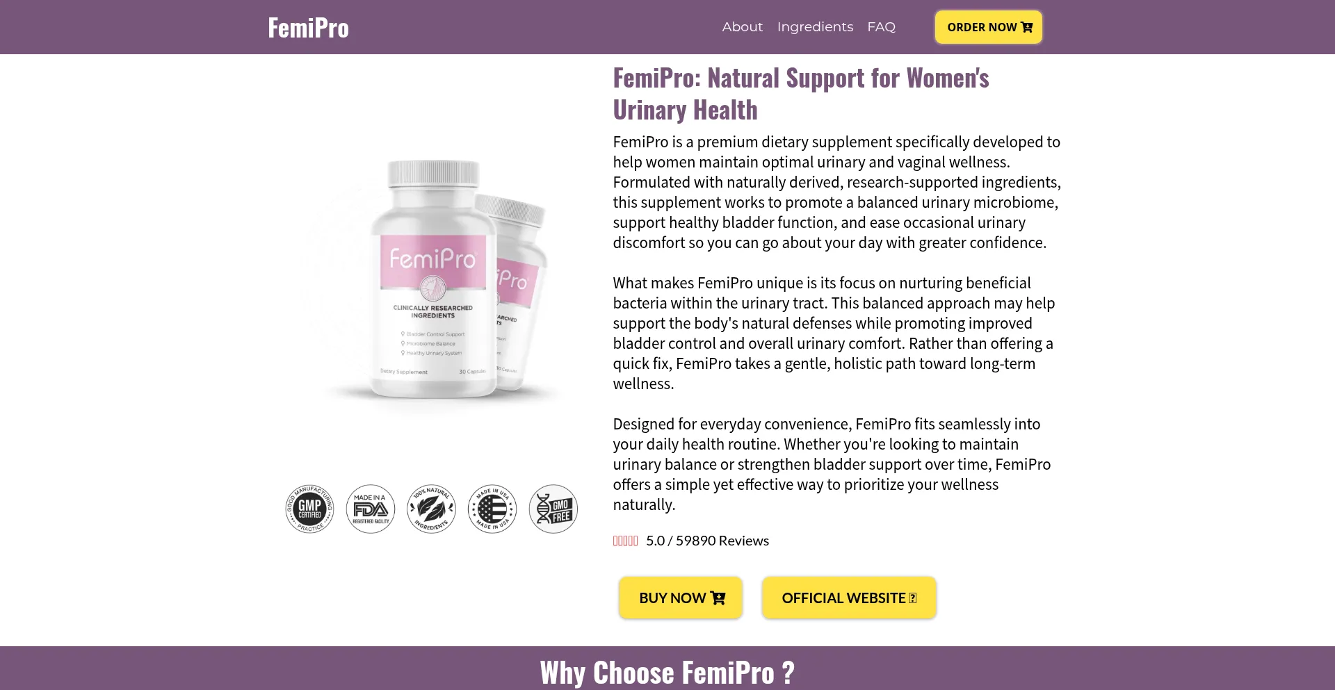 FemiPro is a premium dietary supplement designed to support women’s urinary and vaginal wellness, promoting balance, comfort, and everyday feminine health.