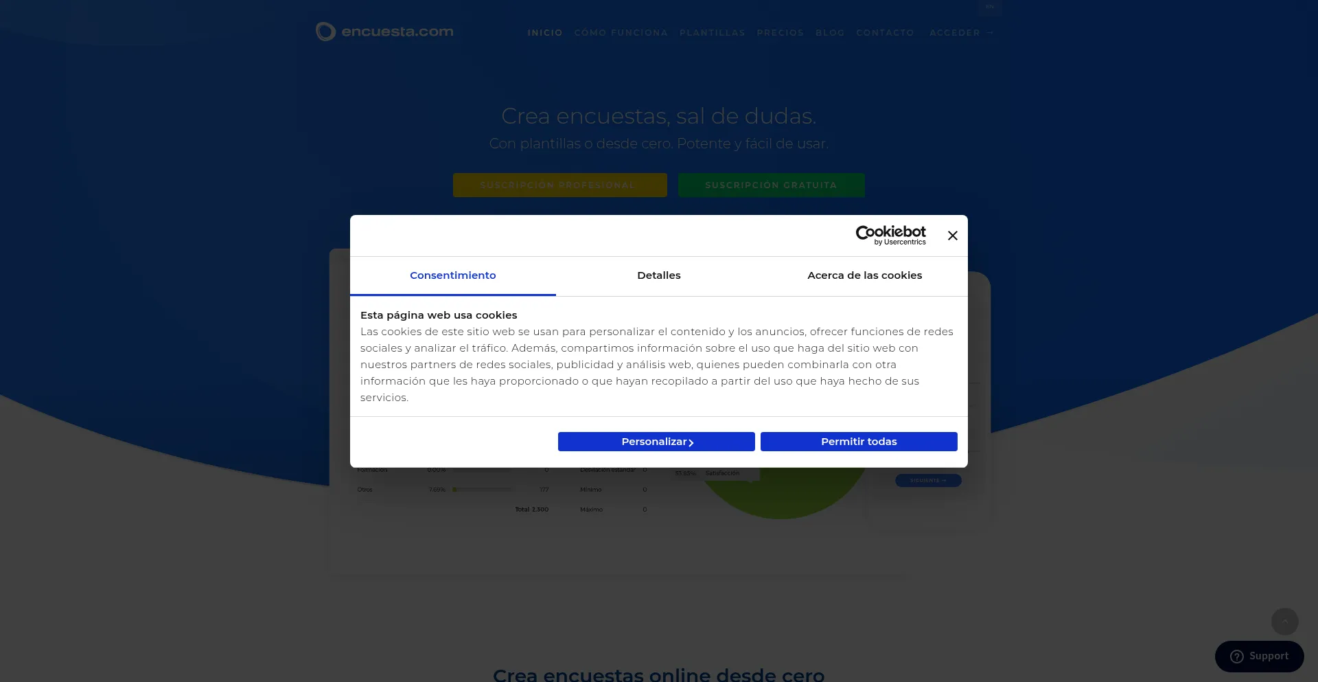 该网站实现符合GDPR或CCPA等隐私法规的cookie同意机制。这表明 encuesta.com 遵守数据保护标准并为用户提供对个人数据收集实践的控制。