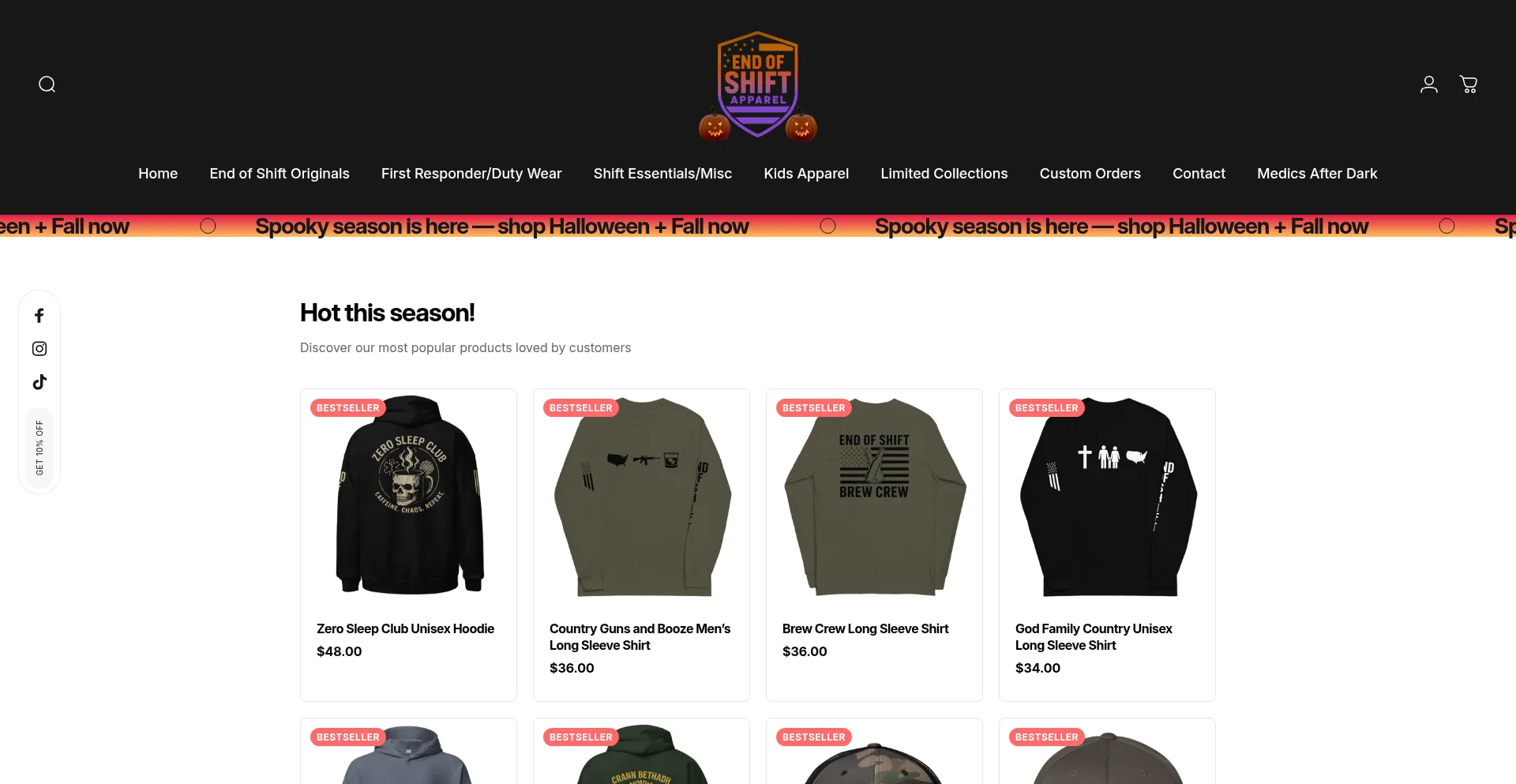 网站上存在社交媒体链接表明 endofshiftapparel.com 在社交媒体上维护官方账户,这是可信度和参与度的积极信号。