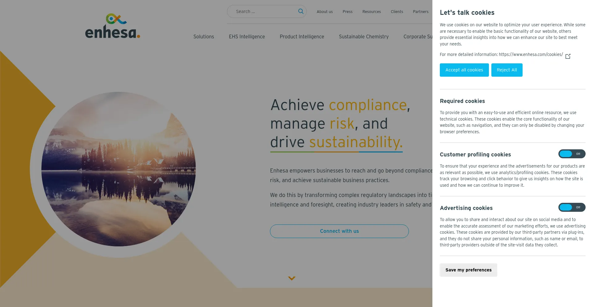 该网站实现符合GDPR或CCPA等隐私法规的cookie同意机制。这表明 enhesa.com 遵守数据保护标准并为用户提供对个人数据收集实践的控制。