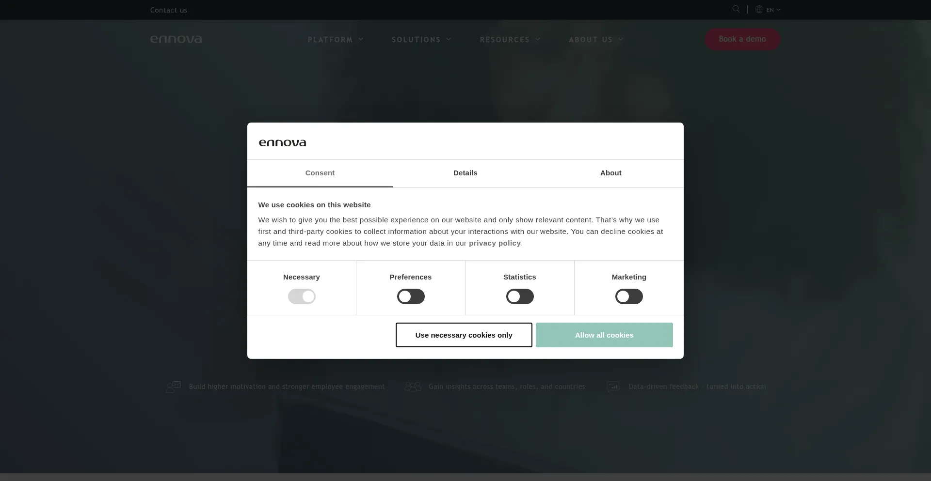 该网站实现符合GDPR或CCPA等隐私法规的cookie同意机制。这表明 ennova.com 遵守数据保护标准并为用户提供对个人数据收集实践的控制。