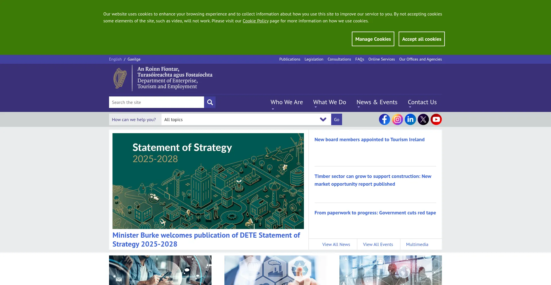 网站上存在社交媒体链接表明 enterprise.gov.ie 在社交媒体上维护官方账户,这是可信度和参与度的积极信号。