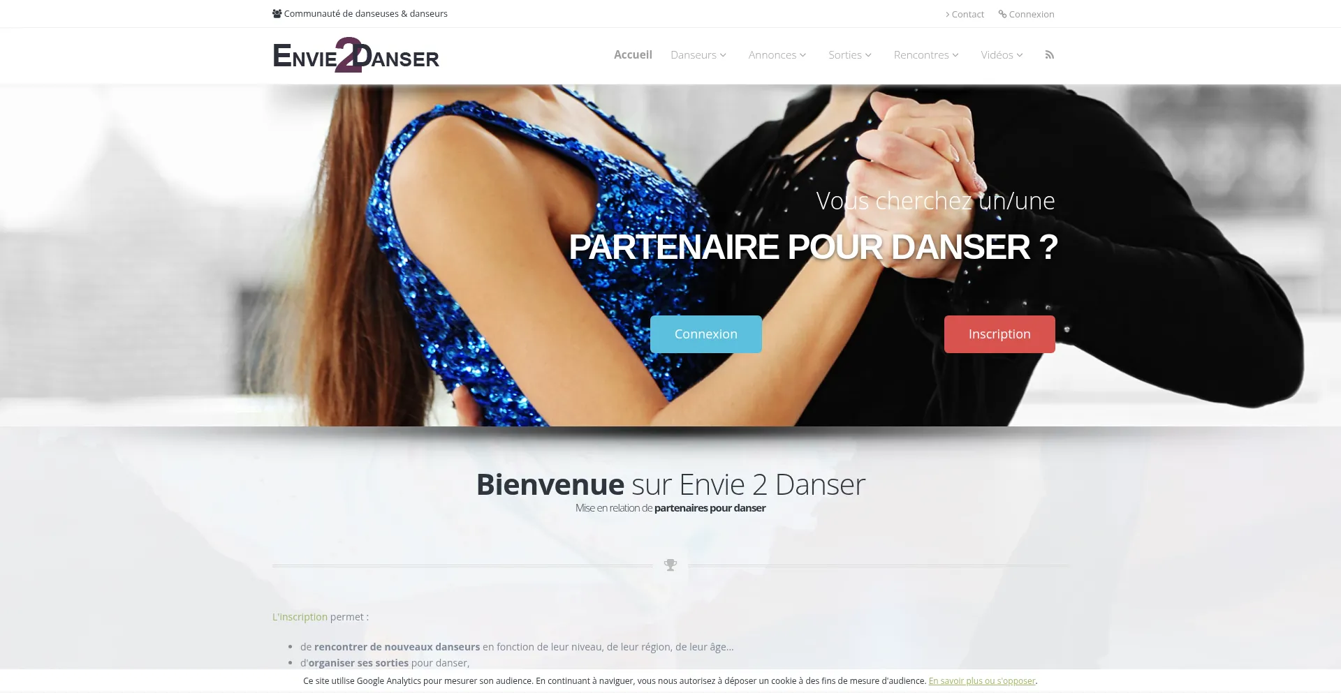 Réseau social pour danseuses et danseurs, mise en relation de partenaires tout style et tout niveau, proposition de sorties, petites annonces, rencontres, chat en ligne