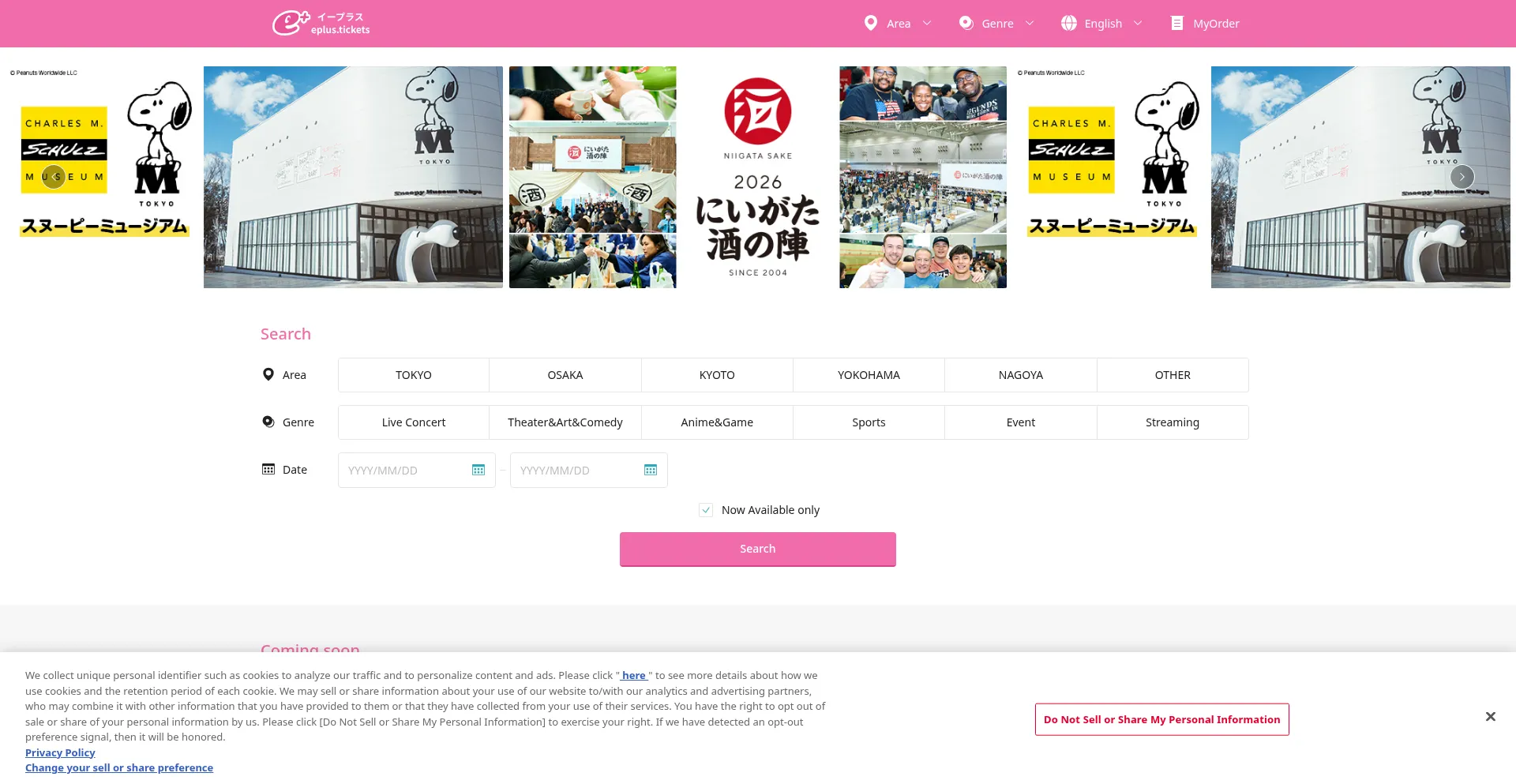 该网站实现符合GDPR或CCPA等隐私法规的cookie同意机制。这表明 eplus.tickets 遵守数据保护标准并为用户提供对个人数据收集实践的控制。