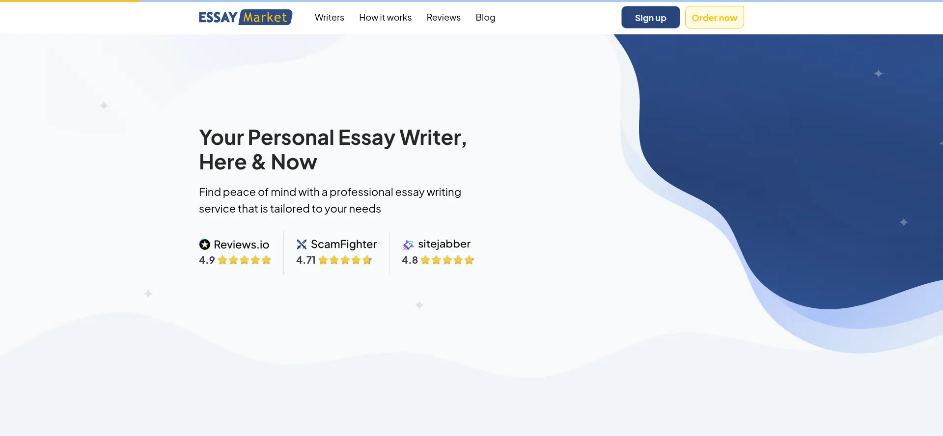 EssayMarket as a professional essay writing service to hire the best personal essay writer online. Top-quality, plagiarism-free essays without AI content are guaranteed.