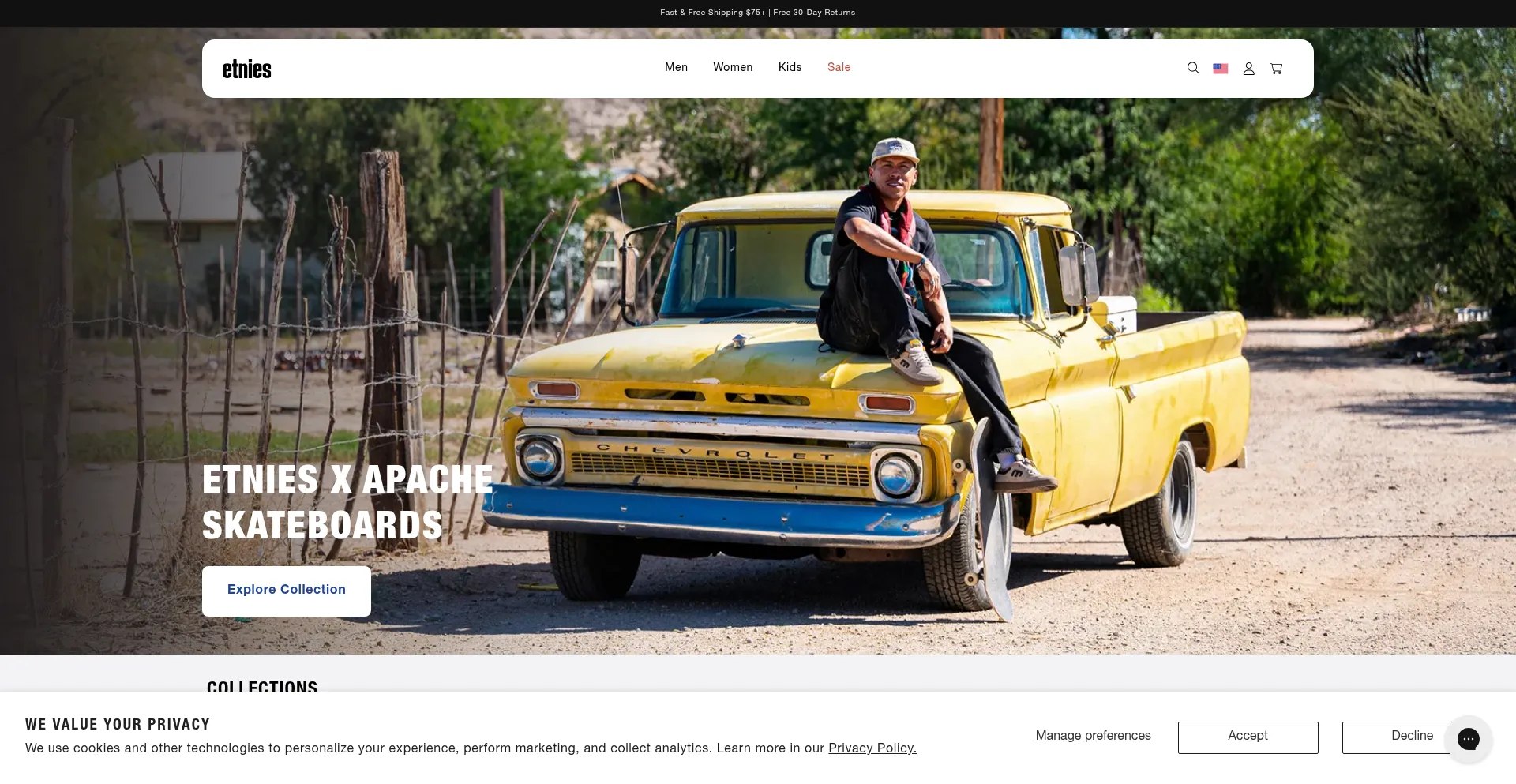 该网站实现符合GDPR或CCPA等隐私法规的cookie同意机制。这表明 etnies.com 遵守数据保护标准并为用户提供对个人数据收集实践的控制。