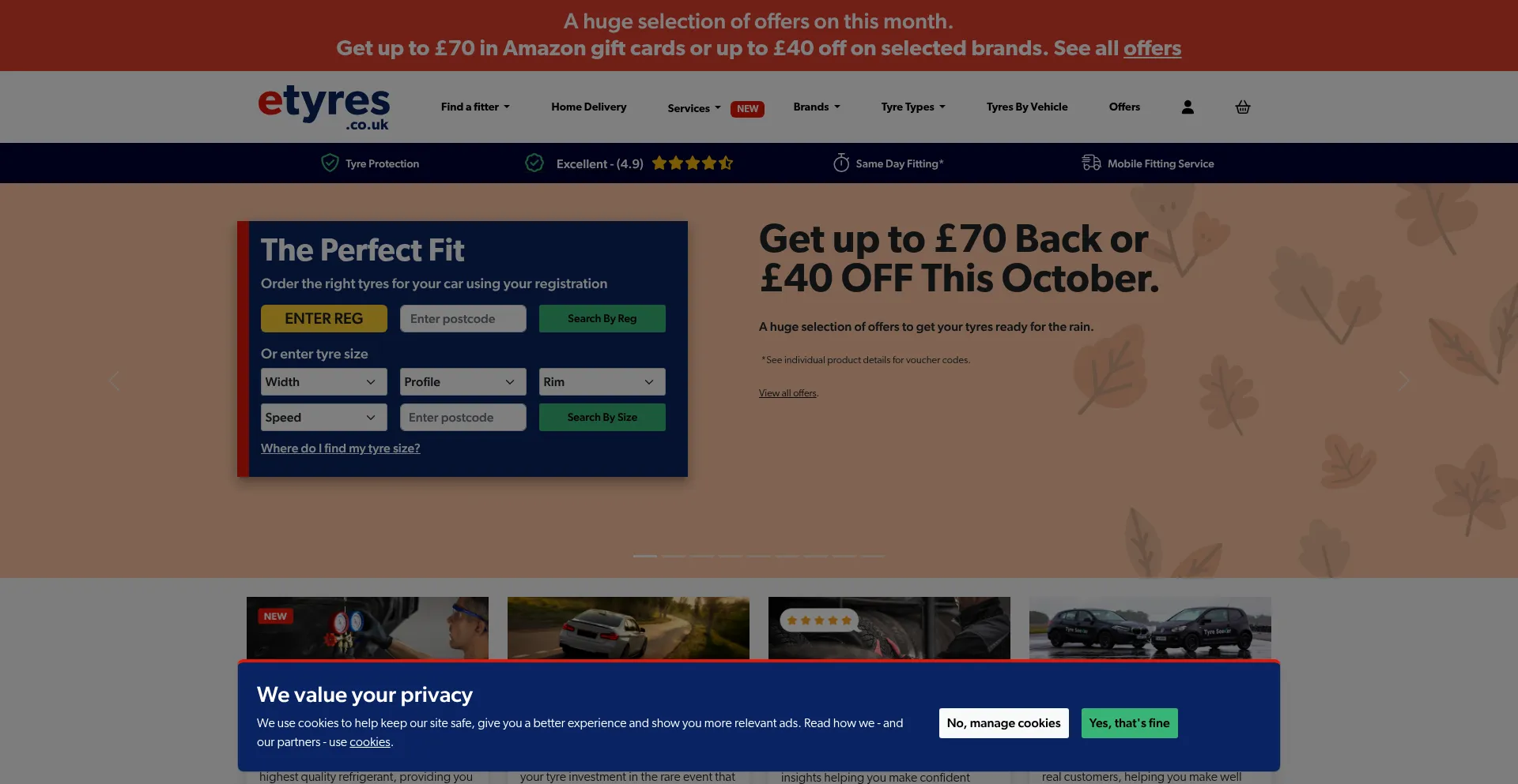该网站实现符合GDPR或CCPA等隐私法规的cookie同意机制。这表明 etyres.co.uk 遵守数据保护标准并为用户提供对个人数据收集实践的控制。