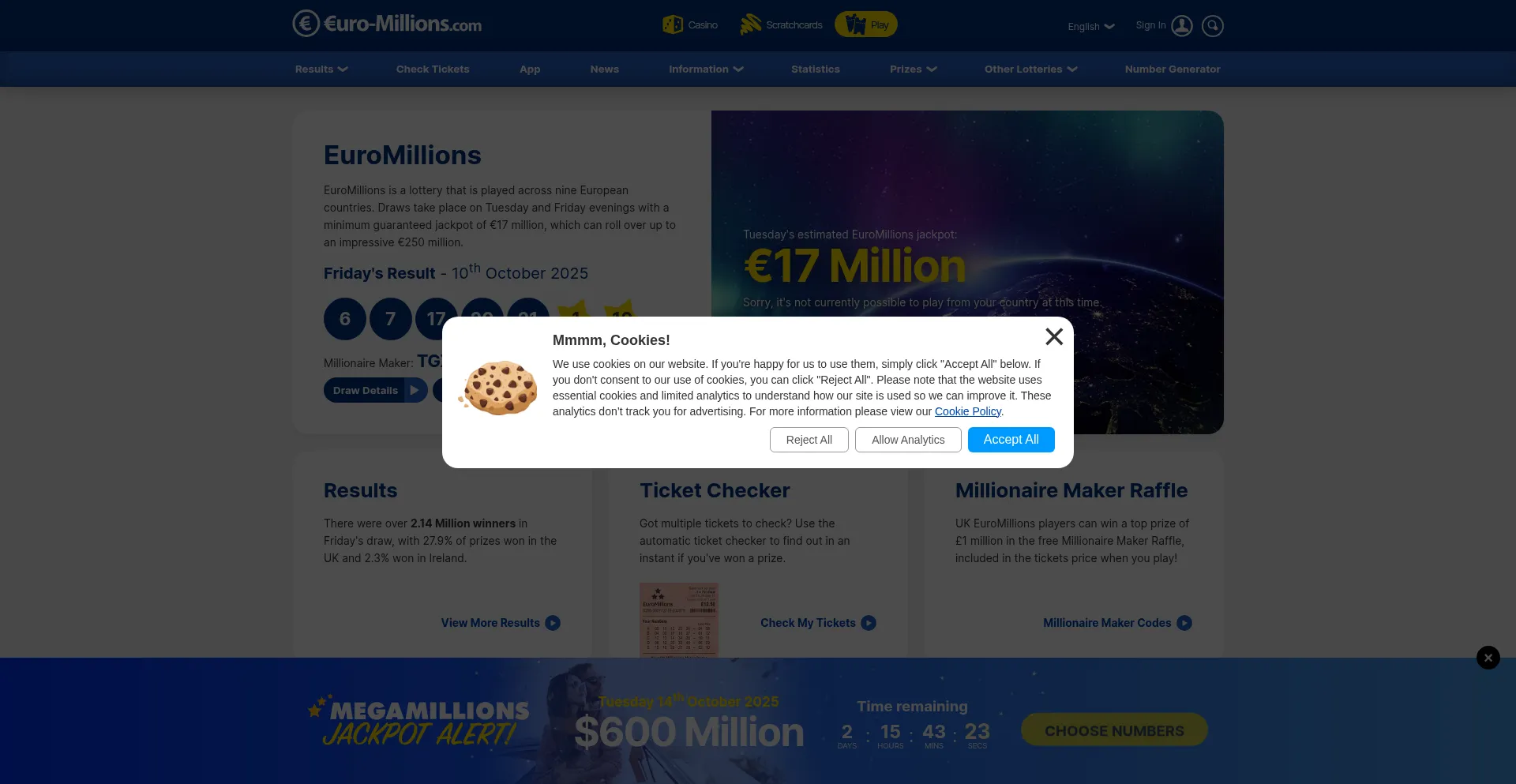 该网站实现符合GDPR或CCPA等隐私法规的cookie同意机制。这表明 euro-millions.com 遵守数据保护标准并为用户提供对个人数据收集实践的控制。