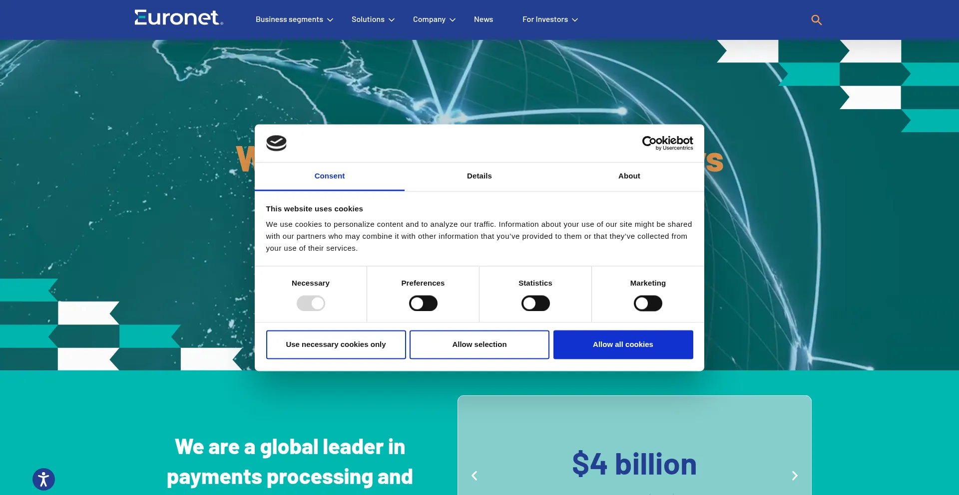 该网站实现符合GDPR或CCPA等隐私法规的cookie同意机制。这表明 euronetworldwide.com 遵守数据保护标准并为用户提供对个人数据收集实践的控制。