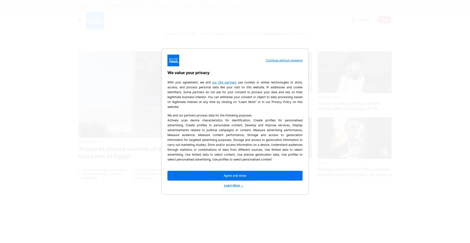 该网站实现符合GDPR或CCPA等隐私法规的cookie同意机制。这表明 euronews.com 遵守数据保护标准并为用户提供对个人数据收集实践的控制。