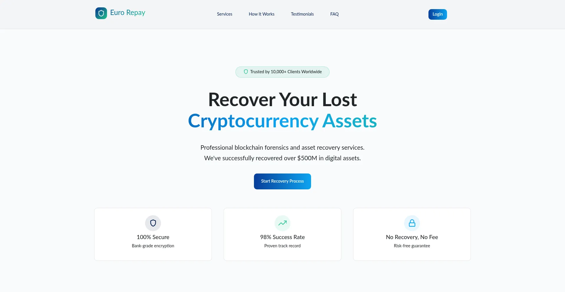 网站 eurorepay.org 宣传针对丢失或被盗资产的资金恢复服务。虽然一些在应急费用结构上运营,其他可能需要预付款,这可能表明欺诈运营。在聘请此类服务前验证凭据和监管合规性。