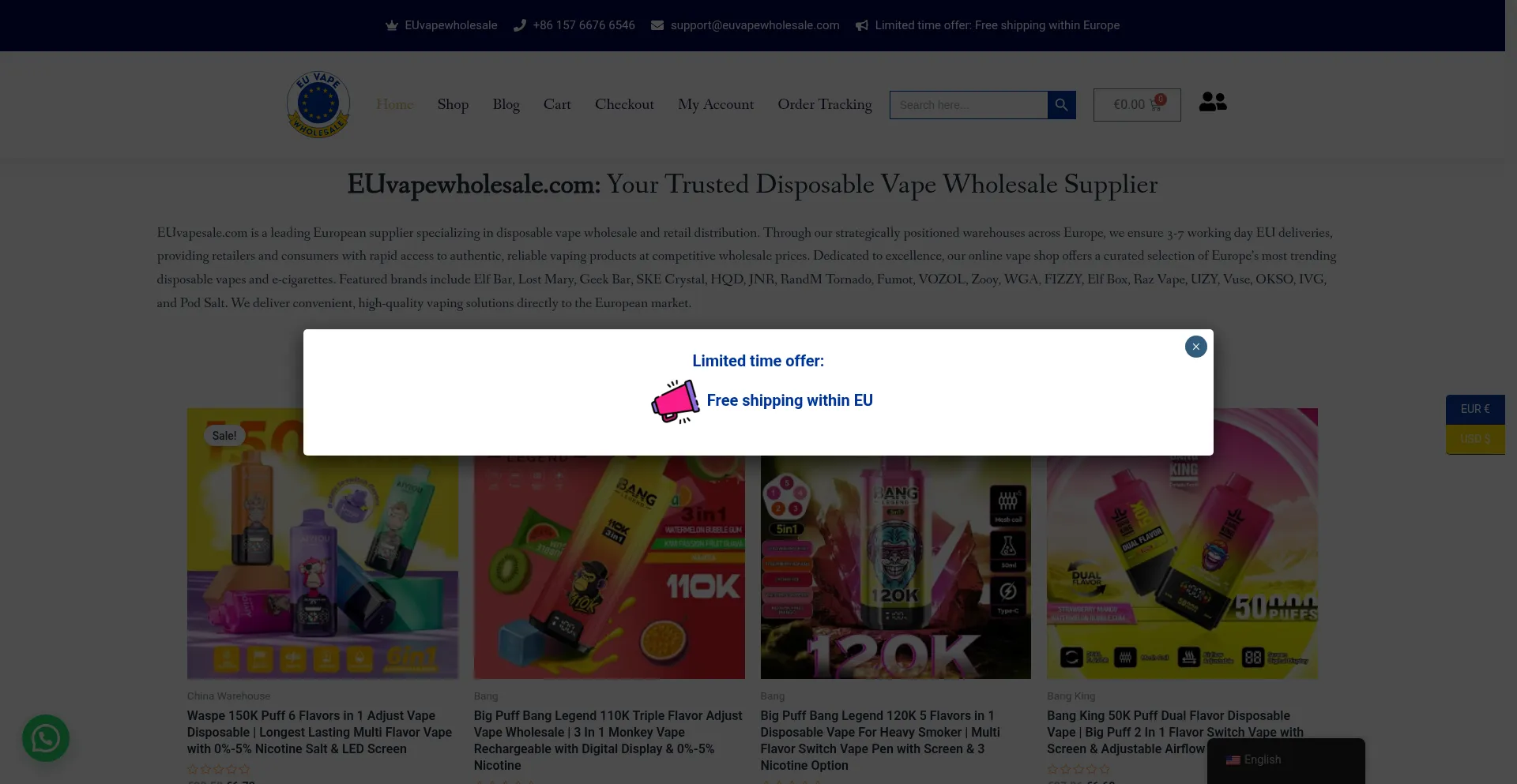 分析表明 euvapewholesale.com 作为电子商务平台运营,促进商品或服务的在线交易。该网站实现了购物车功能、支付处理系统和产品目录功能,这些是商业零售运营的典型特征。