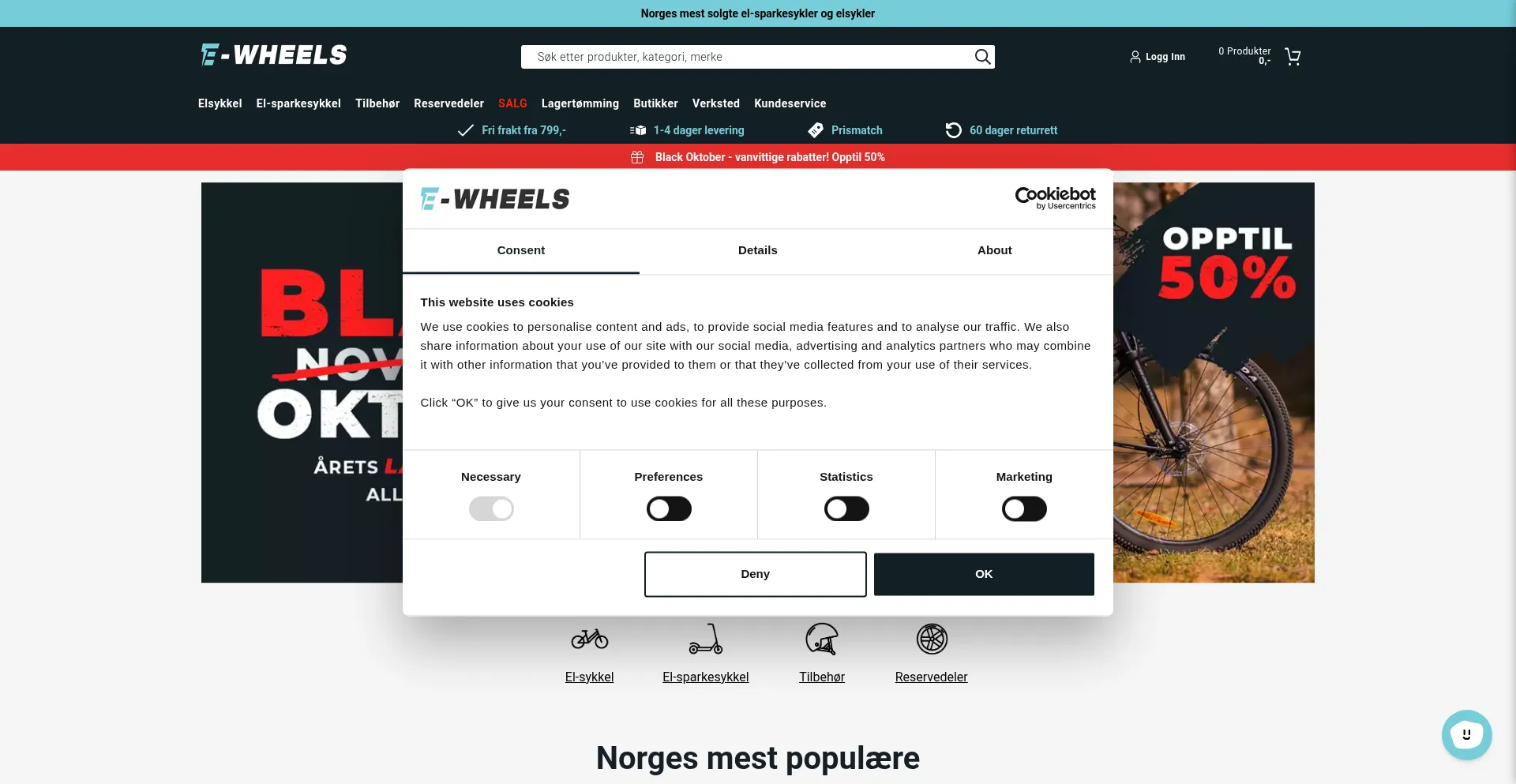 该网站实现符合GDPR或CCPA等隐私法规的cookie同意机制。这表明 ewheels.no 遵守数据保护标准并为用户提供对个人数据收集实践的控制。