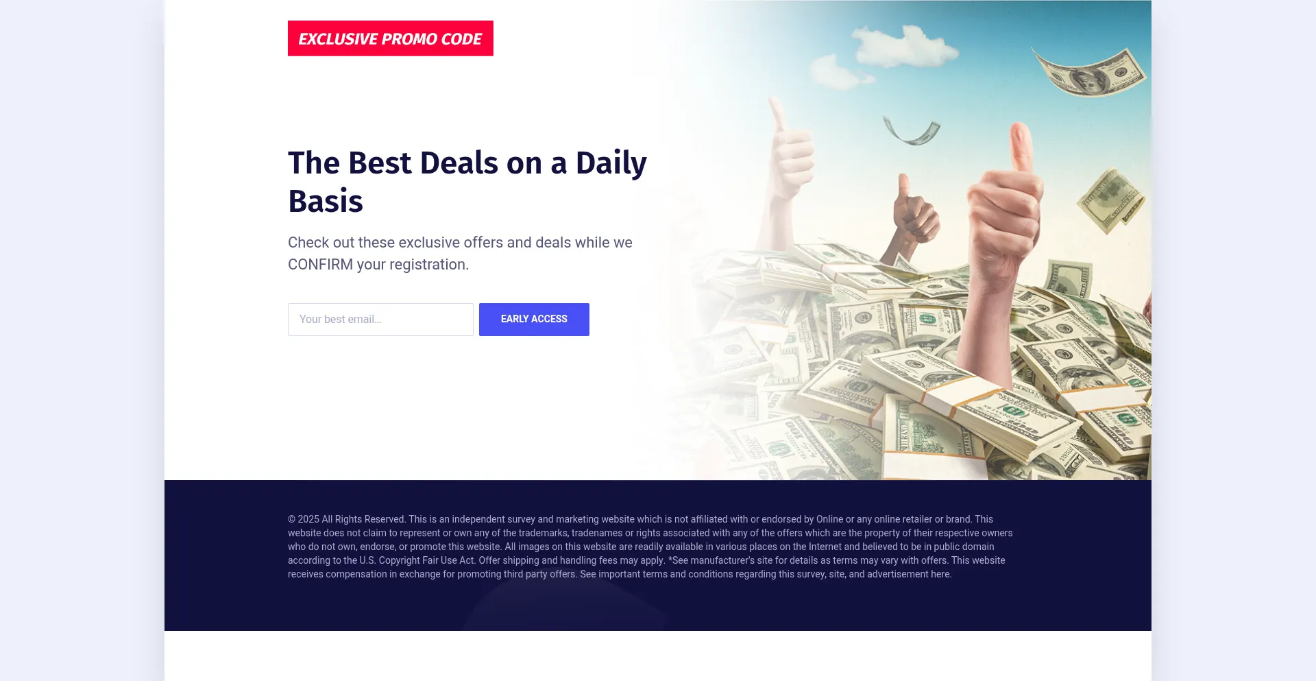 该网站实现数据收集表单,请求个人信息,包括姓名、电子邮件地址、电话号码或其他敏感详细信息。用户应验证 exclusive-promocode.com 的合法性并在提交个人数据前查看隐私政策。