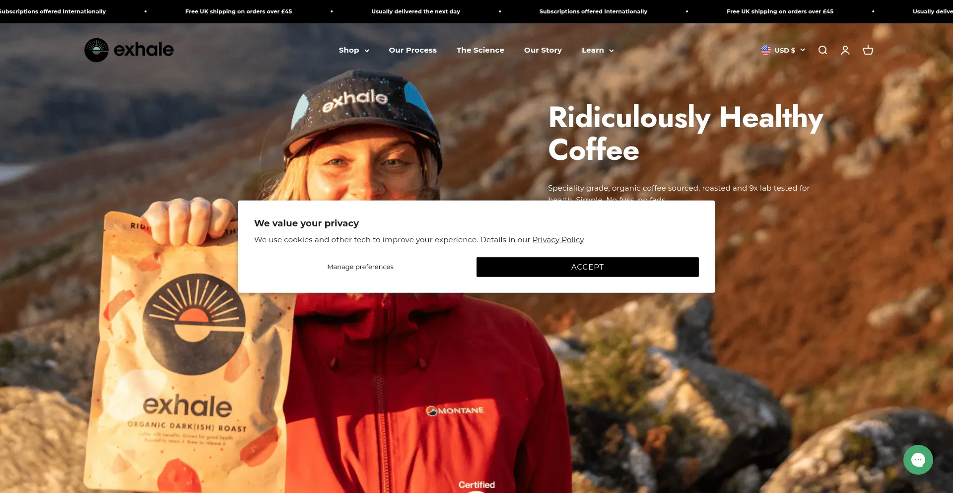 该网站实现符合GDPR或CCPA等隐私法规的cookie同意机制。这表明 exhalecoffee.com 遵守数据保护标准并为用户提供对个人数据收集实践的控制。