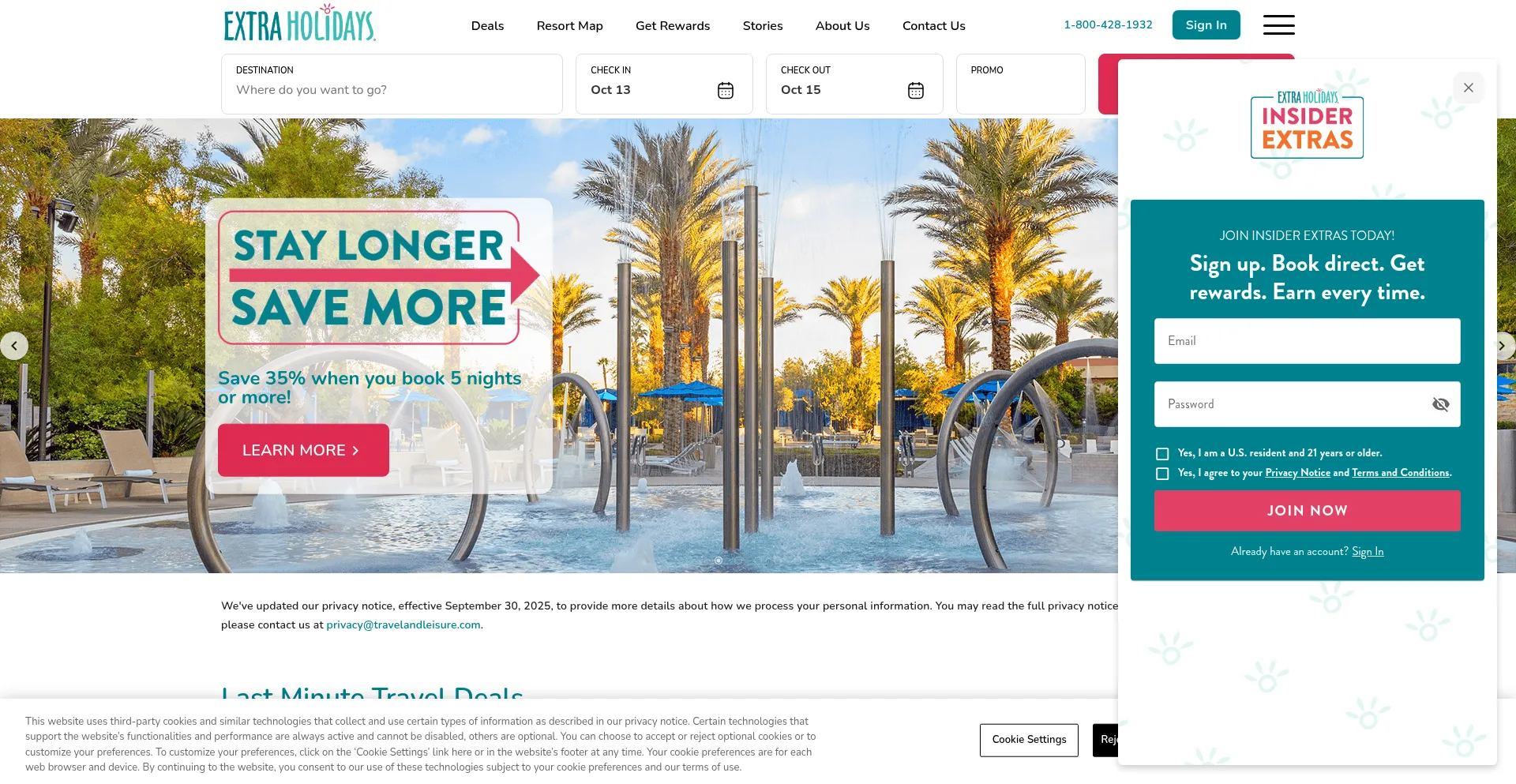 该网站实现符合GDPR或CCPA等隐私法规的cookie同意机制。这表明 extraholidays.com 遵守数据保护标准并为用户提供对个人数据收集实践的控制。