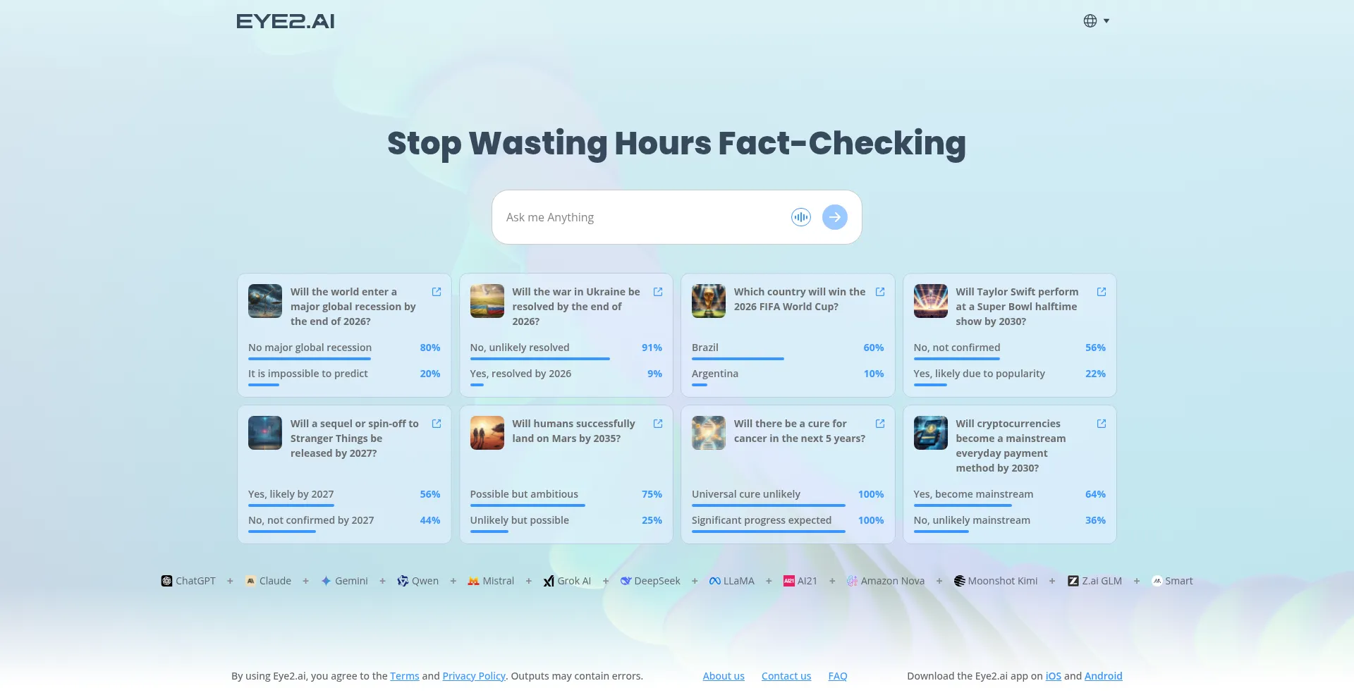 Avoid AI hallucinations and check the reliability of your chosen AI model, such as ChatGPT, with this tool. Eye2.ai is where AIs see eye to eye.