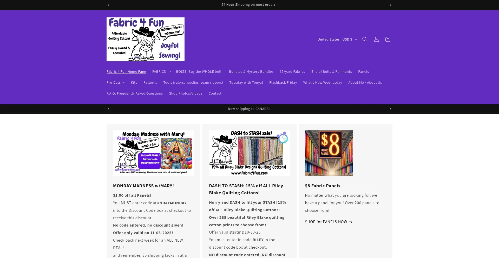 The best Quilt Shop Quality fabrics at the lowest prices! Hundreds of panels to choose from, $5 fabrics EVERY DAY, bundles, bargains, and MORE. Remember, at Fabric 4 Fun....MORE...