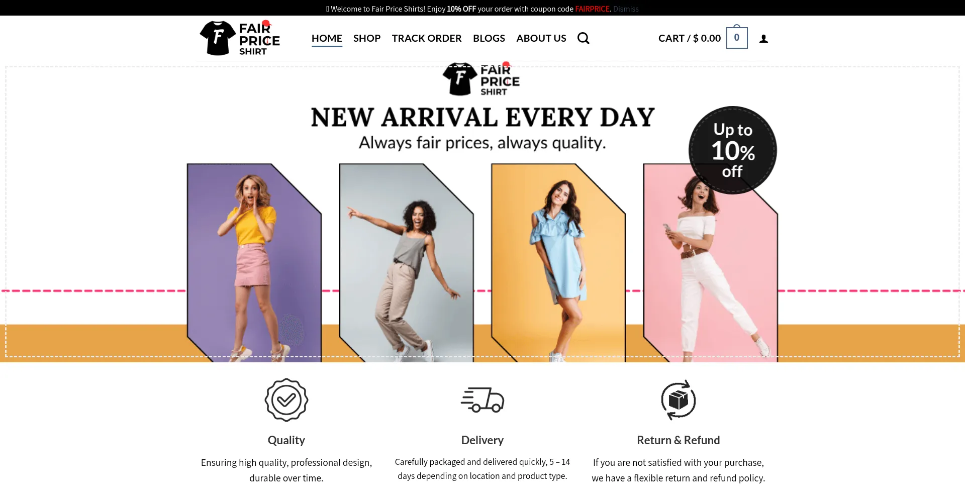 分析表明 fairpriceshirts.com 作为电子商务平台运营,促进商品或服务的在线交易。该网站实现了购物车功能、支付处理系统和产品目录功能,这些是商业零售运营的典型特征。