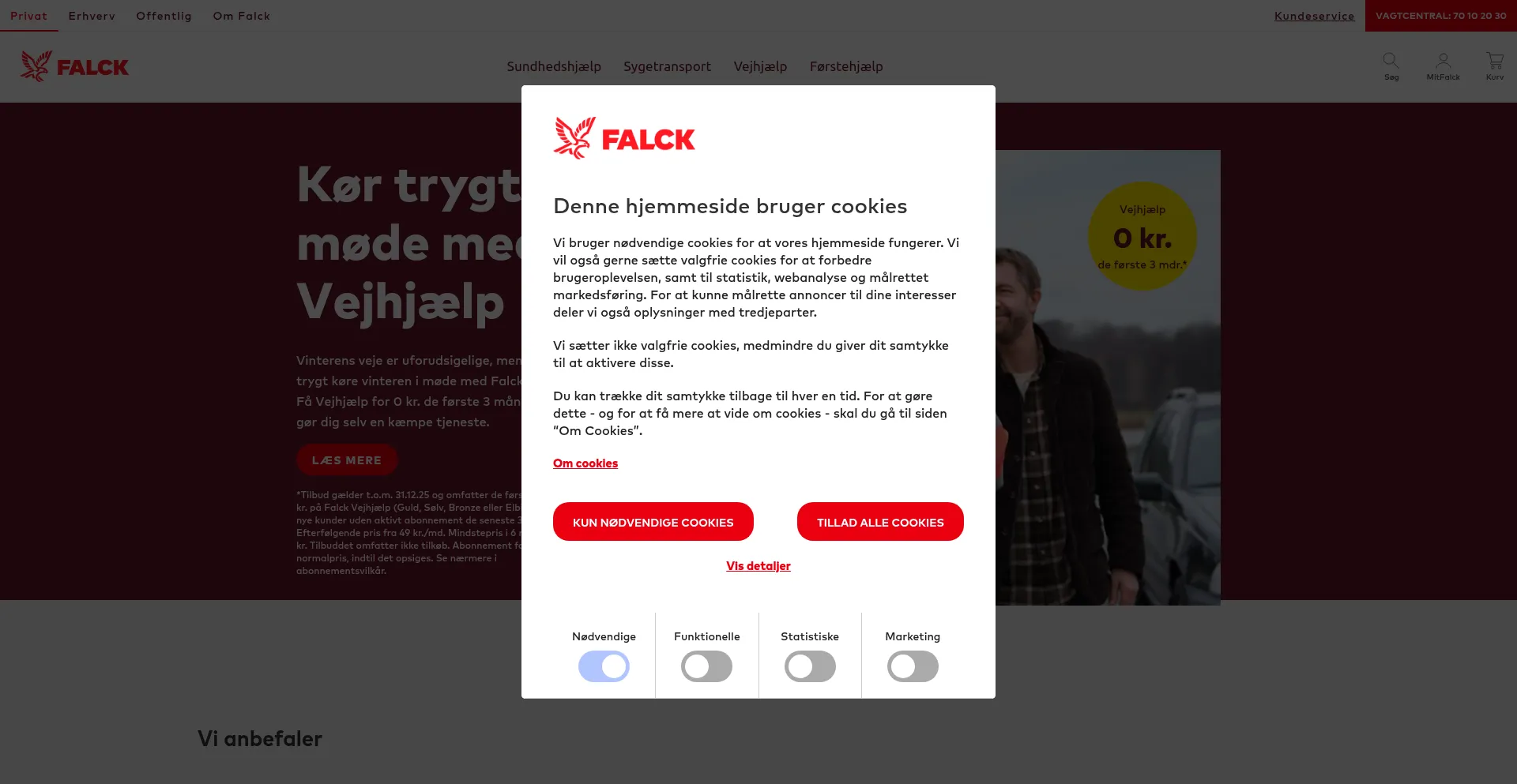 Falck tilbyder Vejhjælp i Danmark og Europa, Sygetransport, Sikkerhedspakke til hjemmet, Sundhedsordning til private og flere førstehjælpskurser & -kasser.