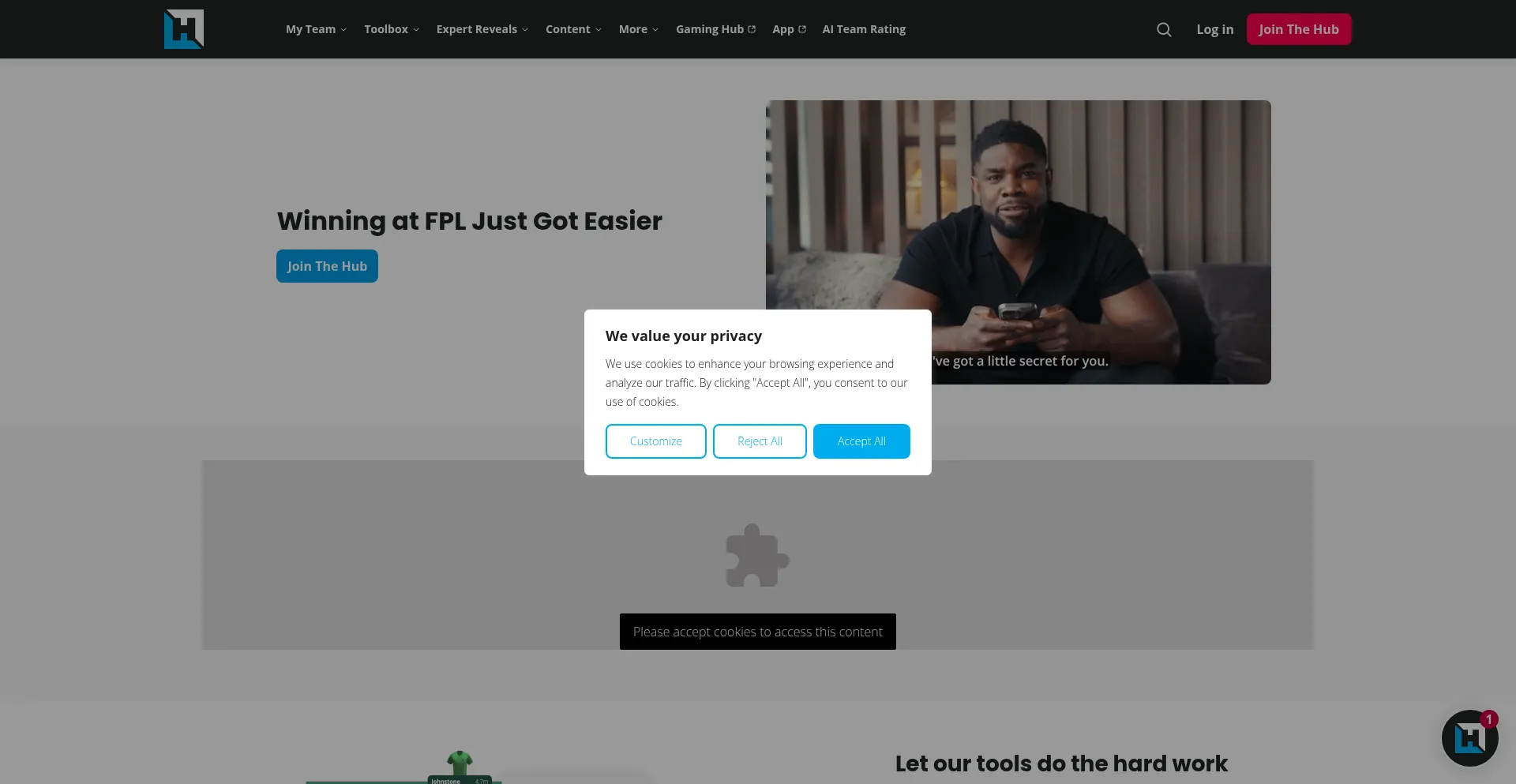 该网站实现符合GDPR或CCPA等隐私法规的cookie同意机制。这表明 fantasyfootballhub.co.uk 遵守数据保护标准并为用户提供对个人数据收集实践的控制。