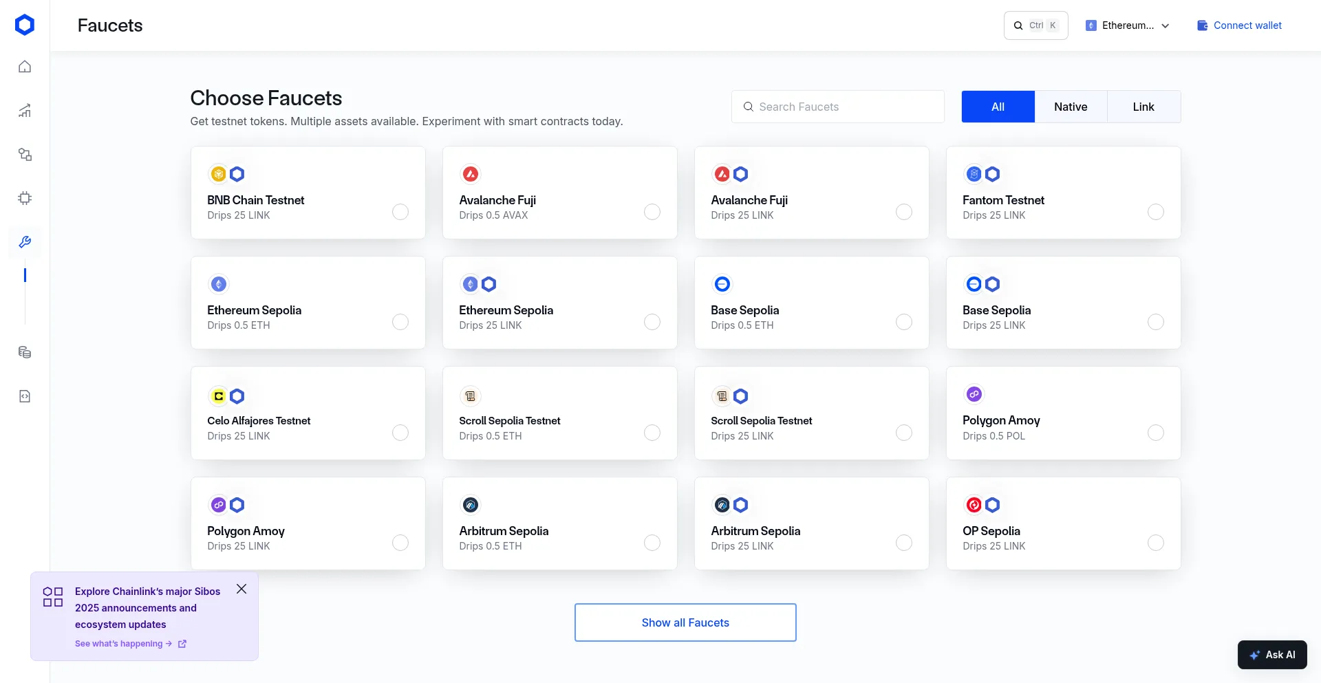 Get testnet tokens from network faucets to experiment with Chainlink and other services.