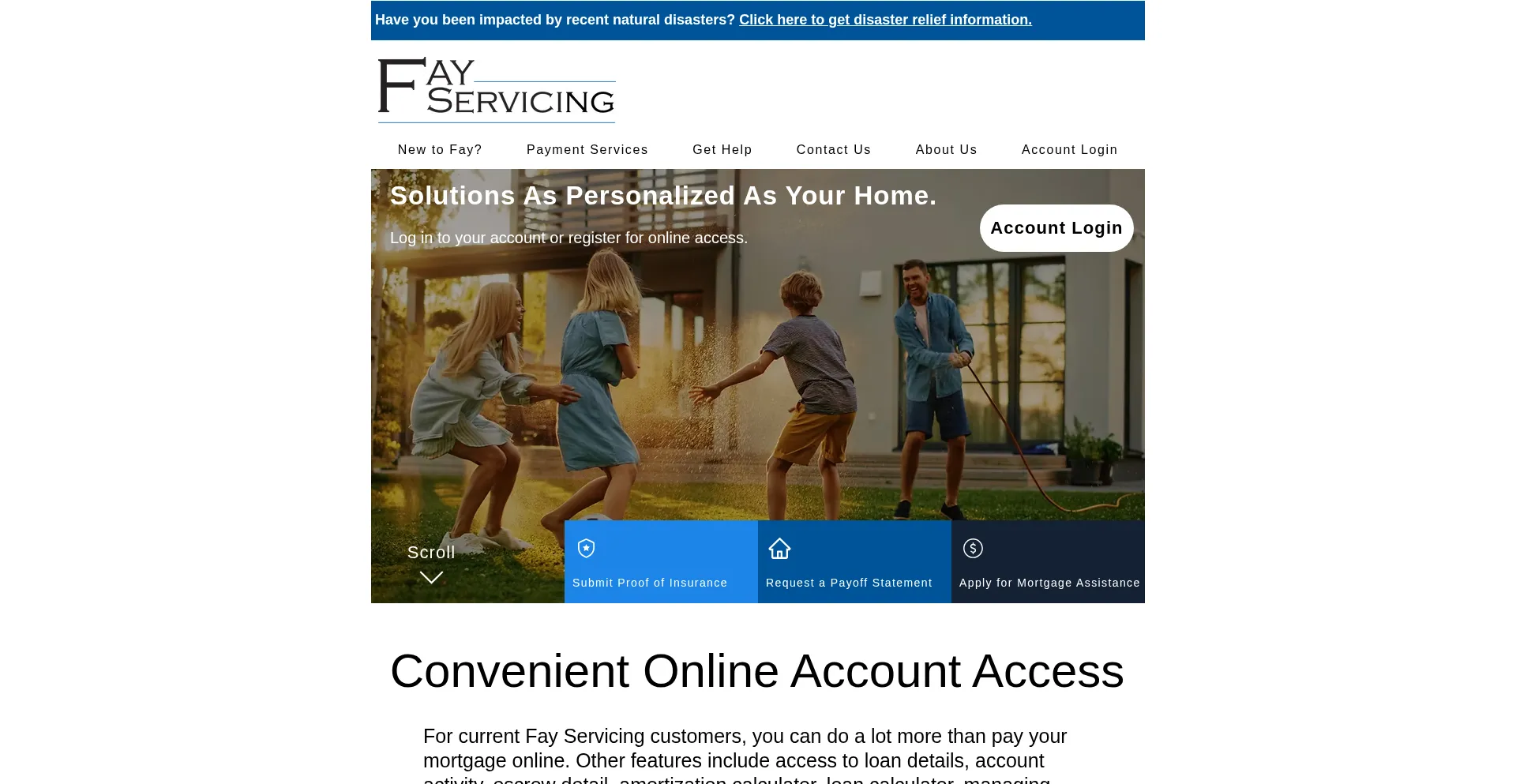 Welcome to Fay Servicing, your trusted Financial Services Company. Experience convenient mortgage loan servicing with personalized online account access solutions.