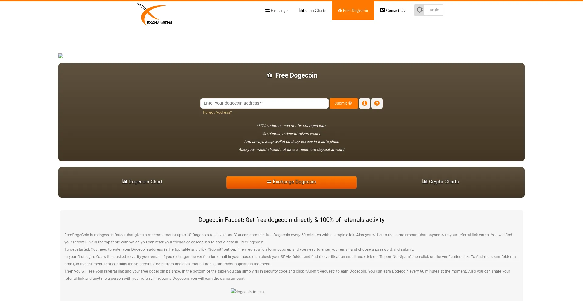 FreeDogeCoin is a dogecoin faucet that gives a random amount up to 10 Dogecoin to all visitors.