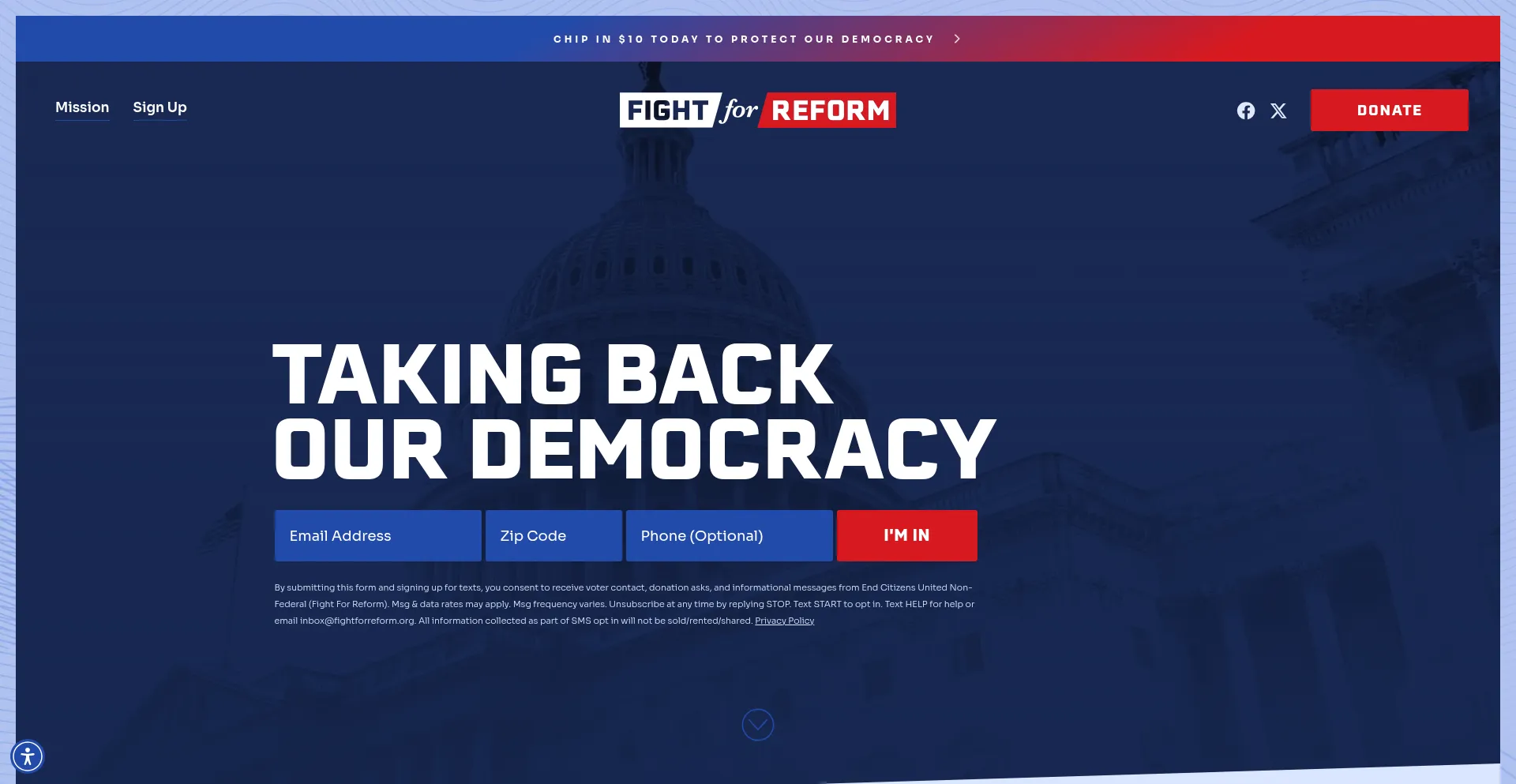 该网站实现数据收集表单,请求个人信息,包括姓名、电子邮件地址、电话号码或其他敏感详细信息。用户应验证 fight4reform.org 的合法性并在提交个人数据前查看隐私政策。