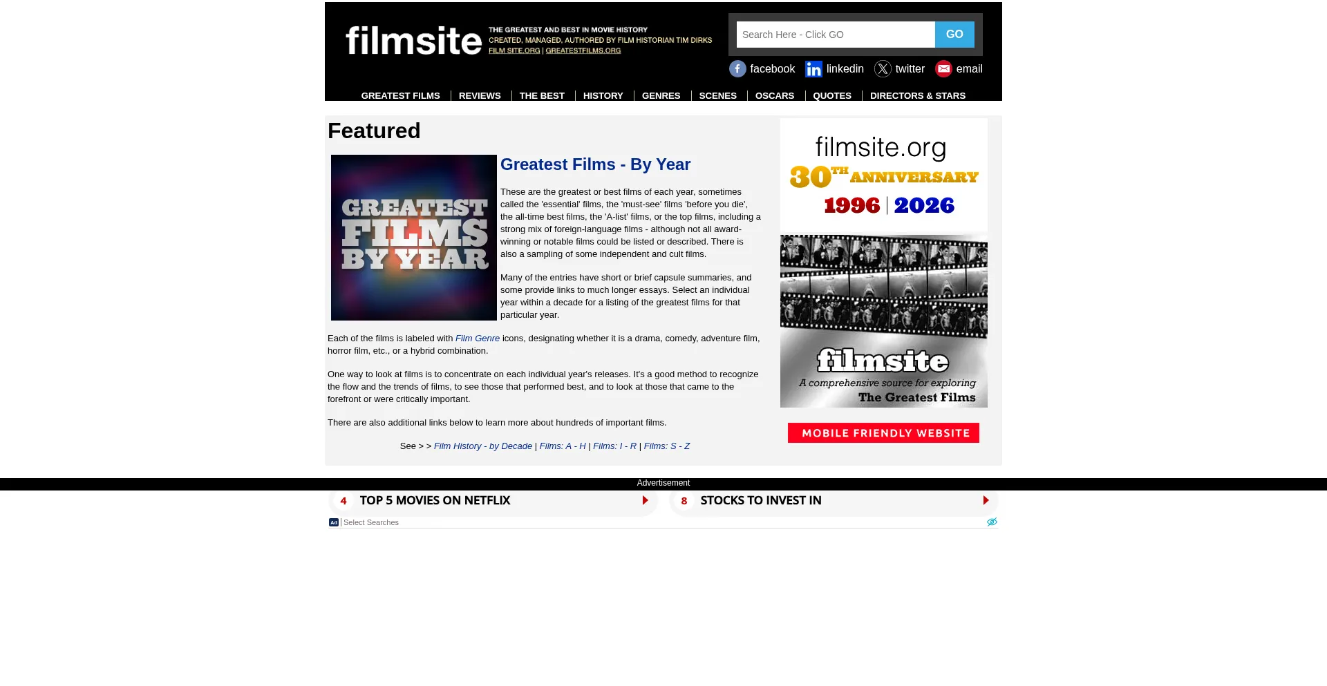 网站上存在社交媒体链接表明 filmsite.org 在社交媒体上维护官方账户,这是可信度和参与度的积极信号。