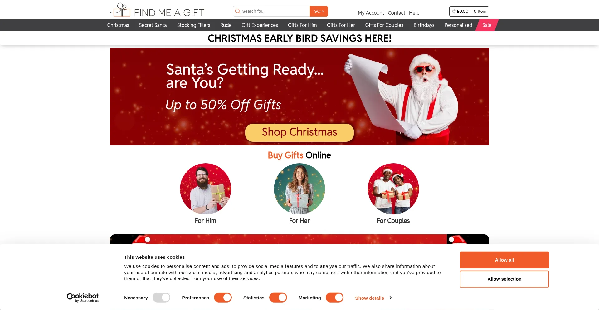 该网站实现符合GDPR或CCPA等隐私法规的cookie同意机制。这表明 findmeagift.co.uk 遵守数据保护标准并为用户提供对个人数据收集实践的控制。