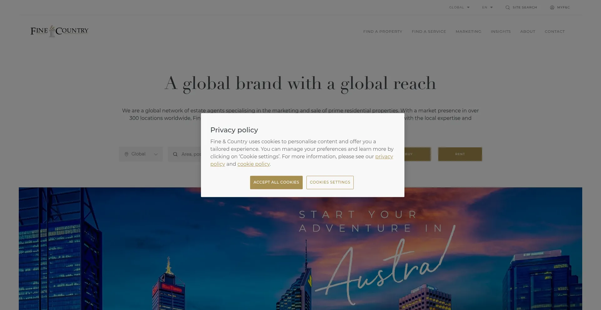 该网站实现符合GDPR或CCPA等隐私法规的cookie同意机制。这表明 fineandcountry.com 遵守数据保护标准并为用户提供对个人数据收集实践的控制。