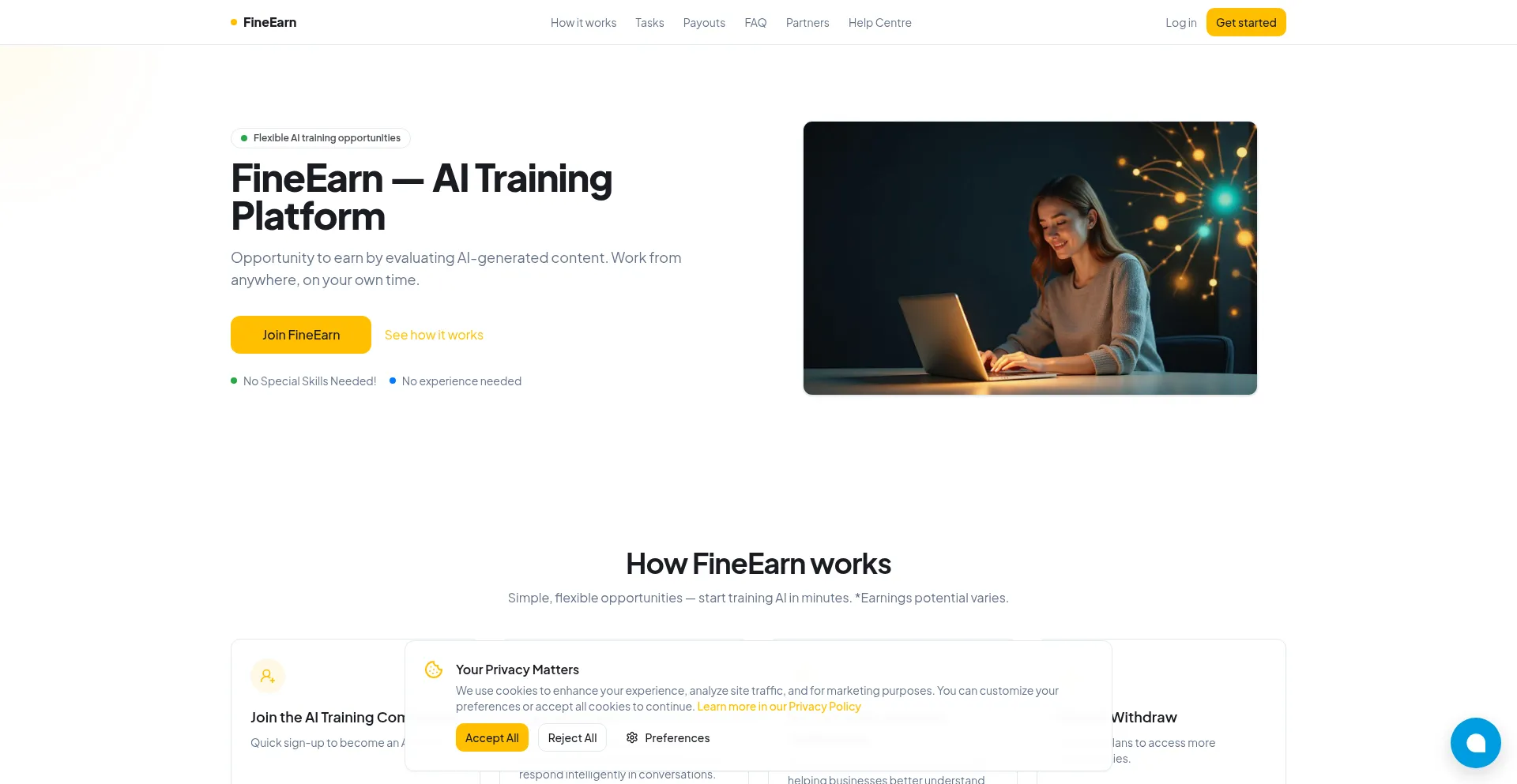 该网站实现符合GDPR或CCPA等隐私法规的cookie同意机制。这表明 fineearn.com 遵守数据保护标准并为用户提供对个人数据收集实践的控制。