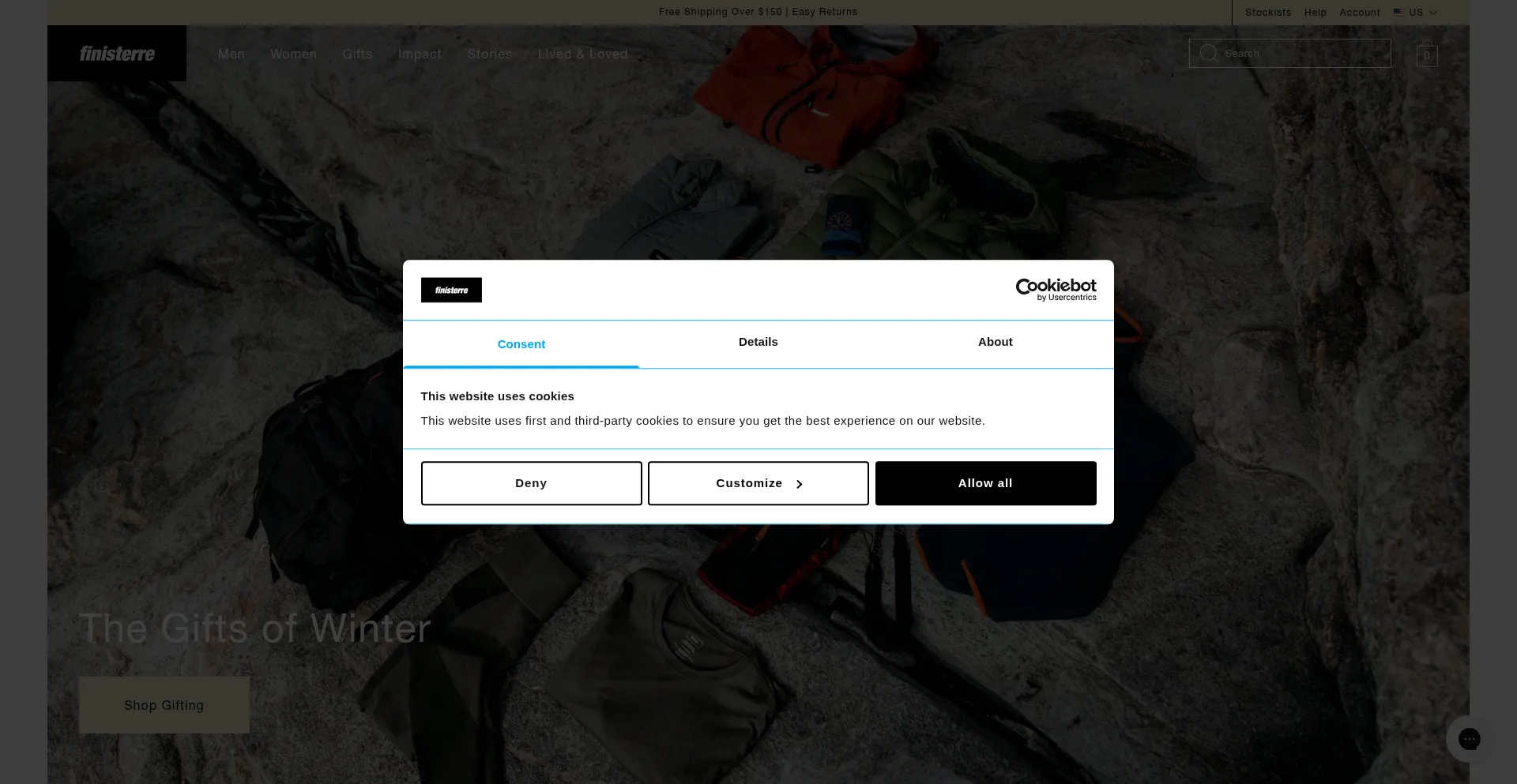 该网站实现符合GDPR或CCPA等隐私法规的cookie同意机制。这表明 finisterre.com 遵守数据保护标准并为用户提供对个人数据收集实践的控制。