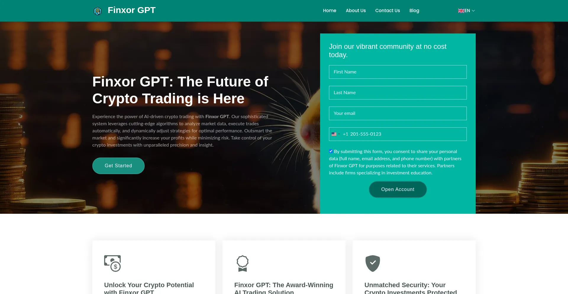 该网站实现数据收集表单,请求个人信息,包括姓名、电子邮件地址、电话号码或其他敏感详细信息。用户应验证 finxorgptsystem.com 的合法性并在提交个人数据前查看隐私政策。