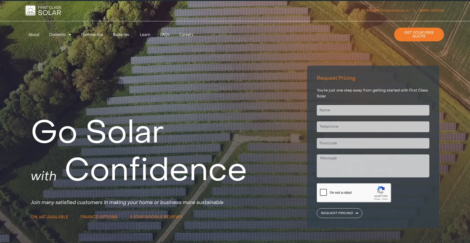 该网站实现数据收集表单,请求个人信息,包括姓名、电子邮件地址、电话号码或其他敏感详细信息。用户应验证 firstclasssolar.co.uk 的合法性并在提交个人数据前查看隐私政策。
