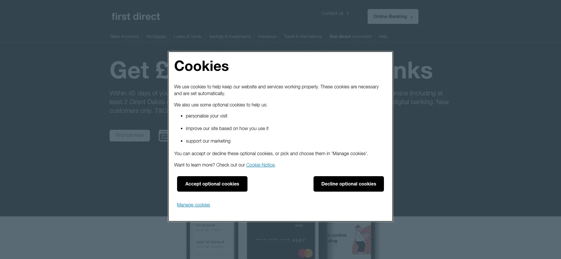 该网站实现符合GDPR或CCPA等隐私法规的cookie同意机制。这表明 firstdirect.com 遵守数据保护标准并为用户提供对个人数据收集实践的控制。