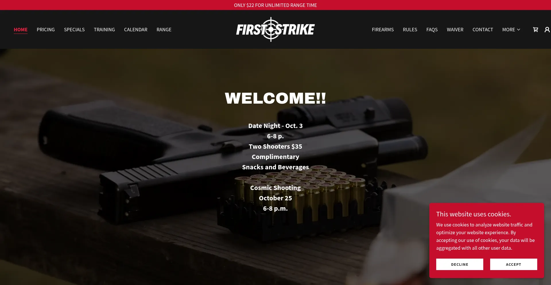 该网站实现符合GDPR或CCPA等隐私法规的cookie同意机制。这表明 firststrikerange.com 遵守数据保护标准并为用户提供对个人数据收集实践的控制。