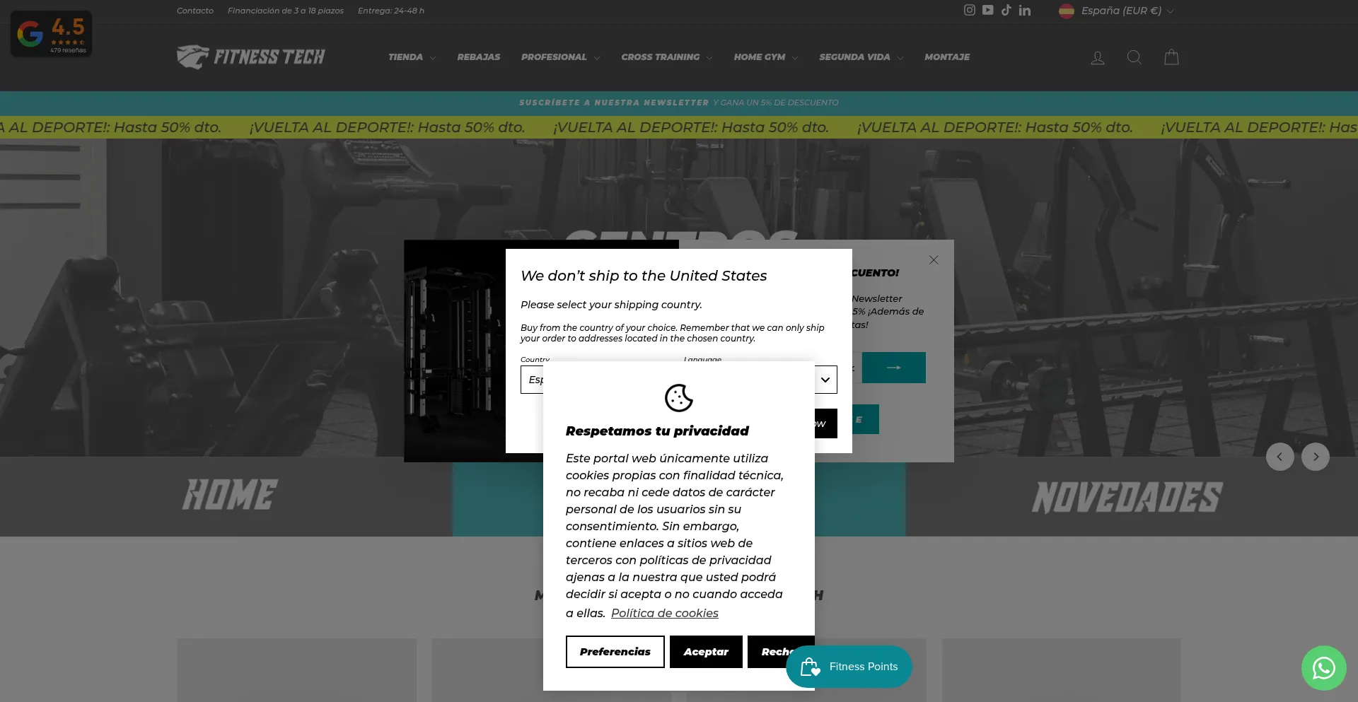 该网站实现数据收集表单,请求个人信息,包括姓名、电子邮件地址、电话号码或其他敏感详细信息。用户应验证 fitnesstech.es 的合法性并在提交个人数据前查看隐私政策。