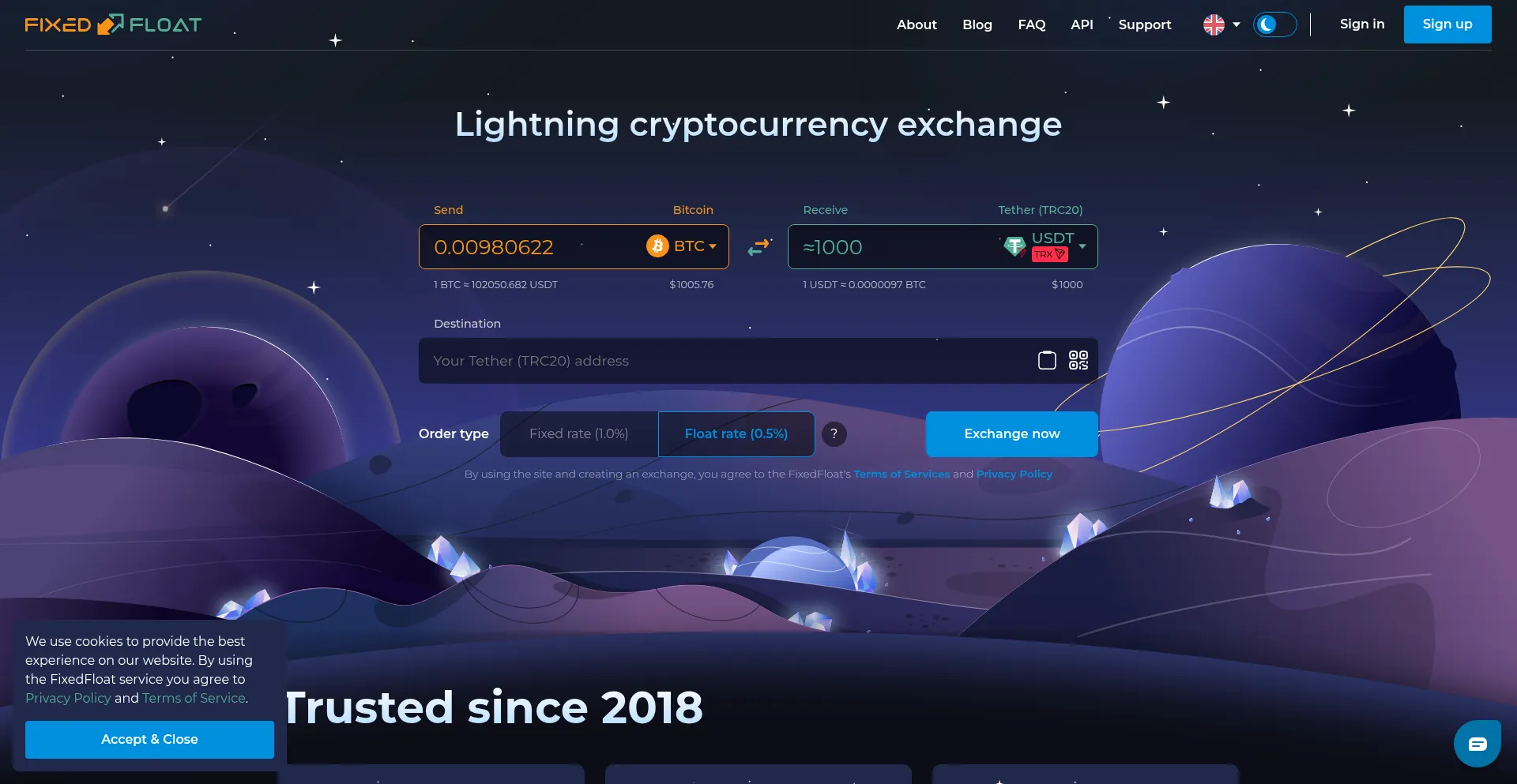 该网站实现符合GDPR或CCPA等隐私法规的cookie同意机制。这表明 fixedfloat.com 遵守数据保护标准并为用户提供对个人数据收集实践的控制。