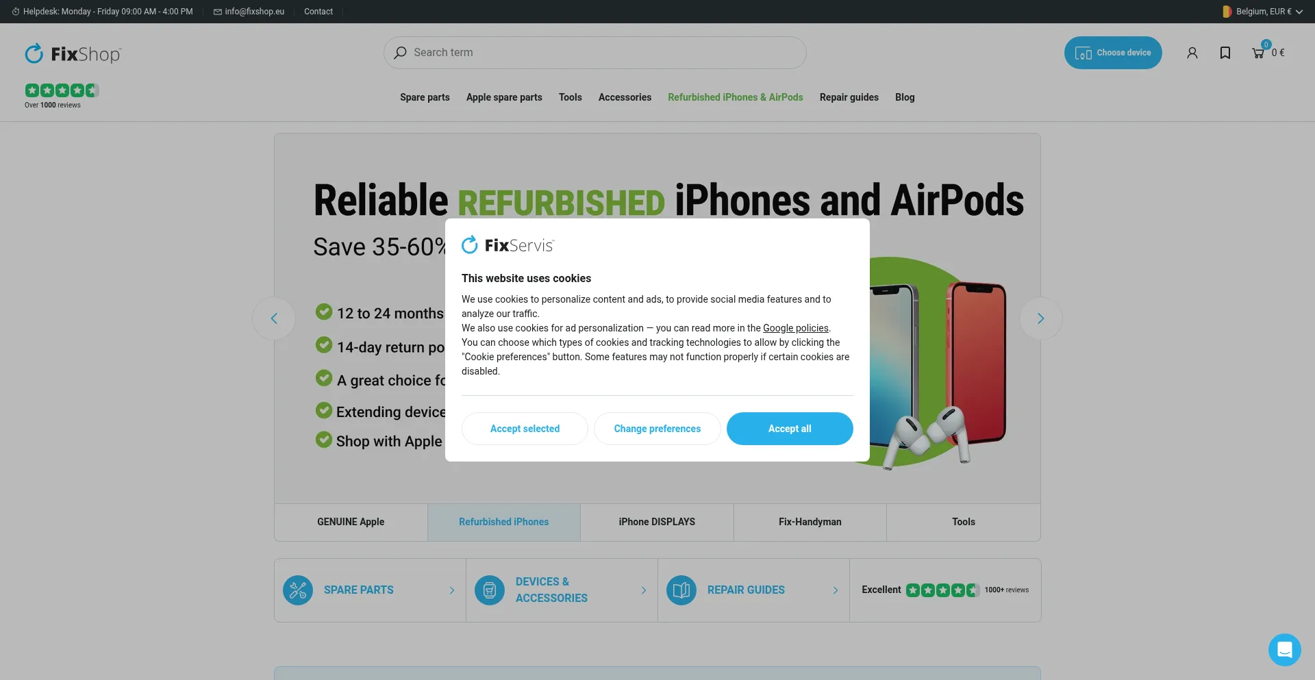 该网站实现符合GDPR或CCPA等隐私法规的cookie同意机制。这表明 fixshop.eu 遵守数据保护标准并为用户提供对个人数据收集实践的控制。