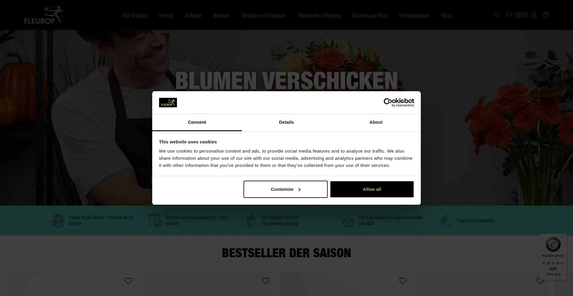 该网站实现符合GDPR或CCPA等隐私法规的cookie同意机制。这表明 fleurop.de 遵守数据保护标准并为用户提供对个人数据收集实践的控制。