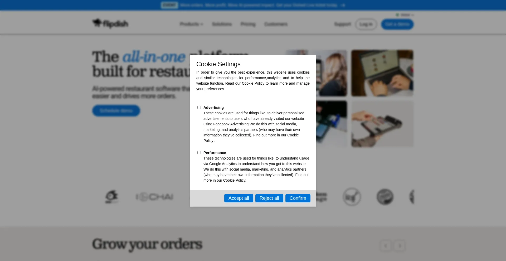 该网站实现符合GDPR或CCPA等隐私法规的cookie同意机制。这表明 flipdish.com 遵守数据保护标准并为用户提供对个人数据收集实践的控制。