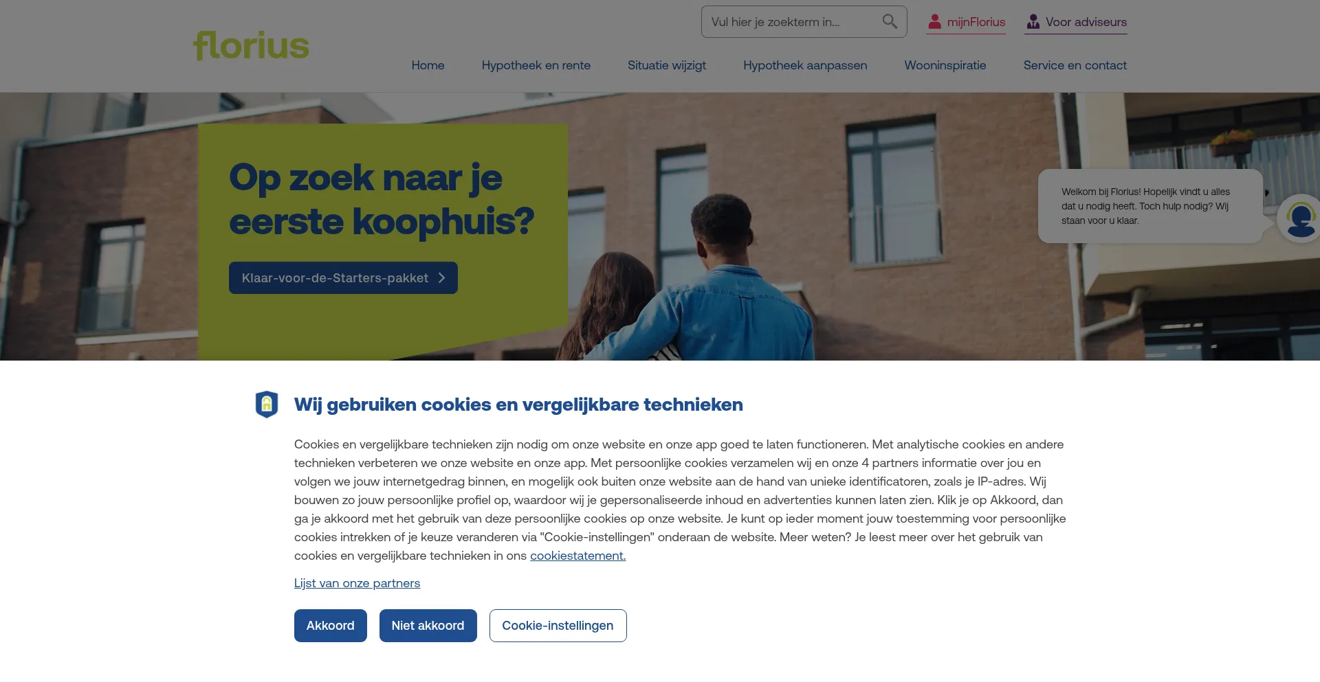 该网站实现符合GDPR或CCPA等隐私法规的cookie同意机制。这表明 florius.nl 遵守数据保护标准并为用户提供对个人数据收集实践的控制。