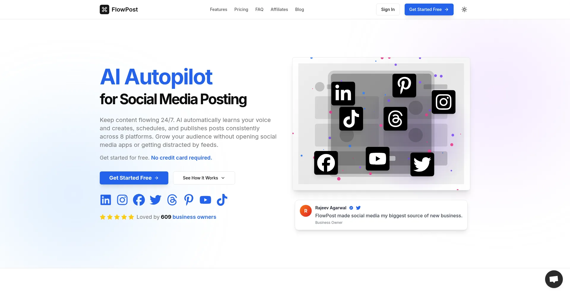 网站 flowpost.ai 被配置为一个带有移动应用功能的网络应用。用户可以直接将该网站安装到设备的桌面上,以快速访问并享受类似移动应用的体验。