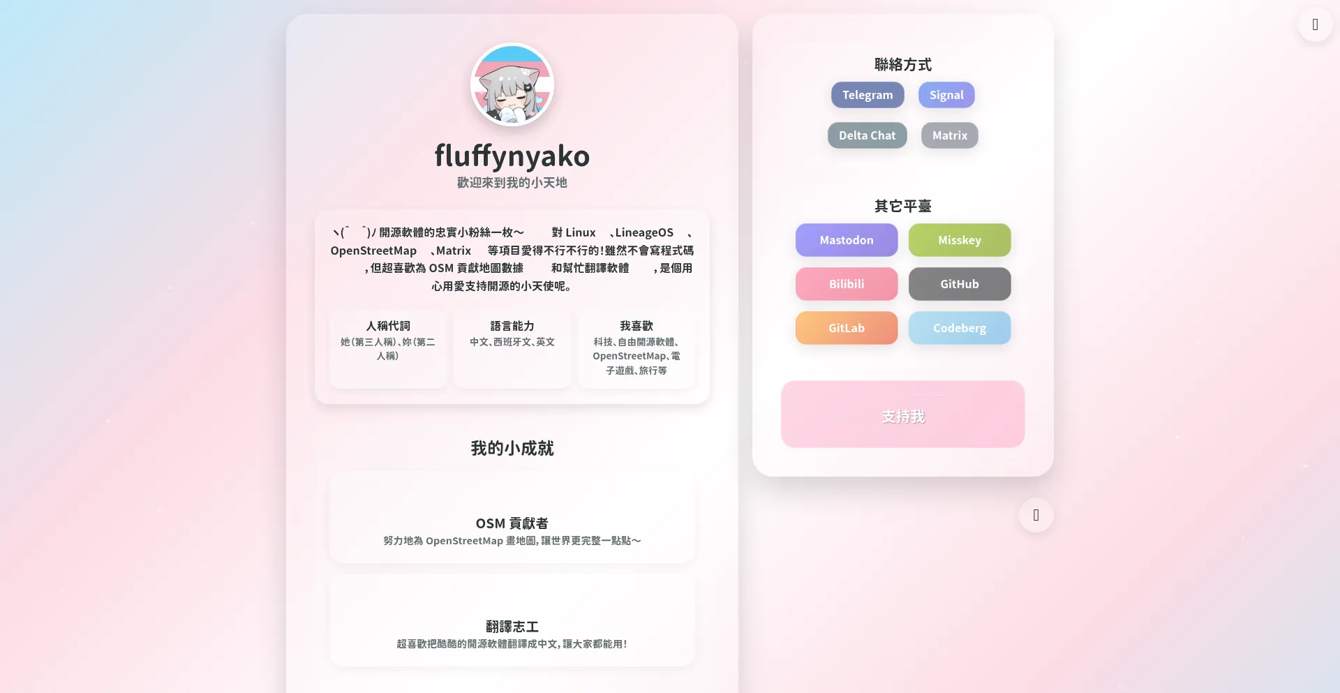 歡迎來到 fluffynyako 的小天地!這是一個充滿熱情的開源軟體粉絲的個人網站,可以在這裡快速瞭解我,查看我的聯絡方式及社交平臺�...
